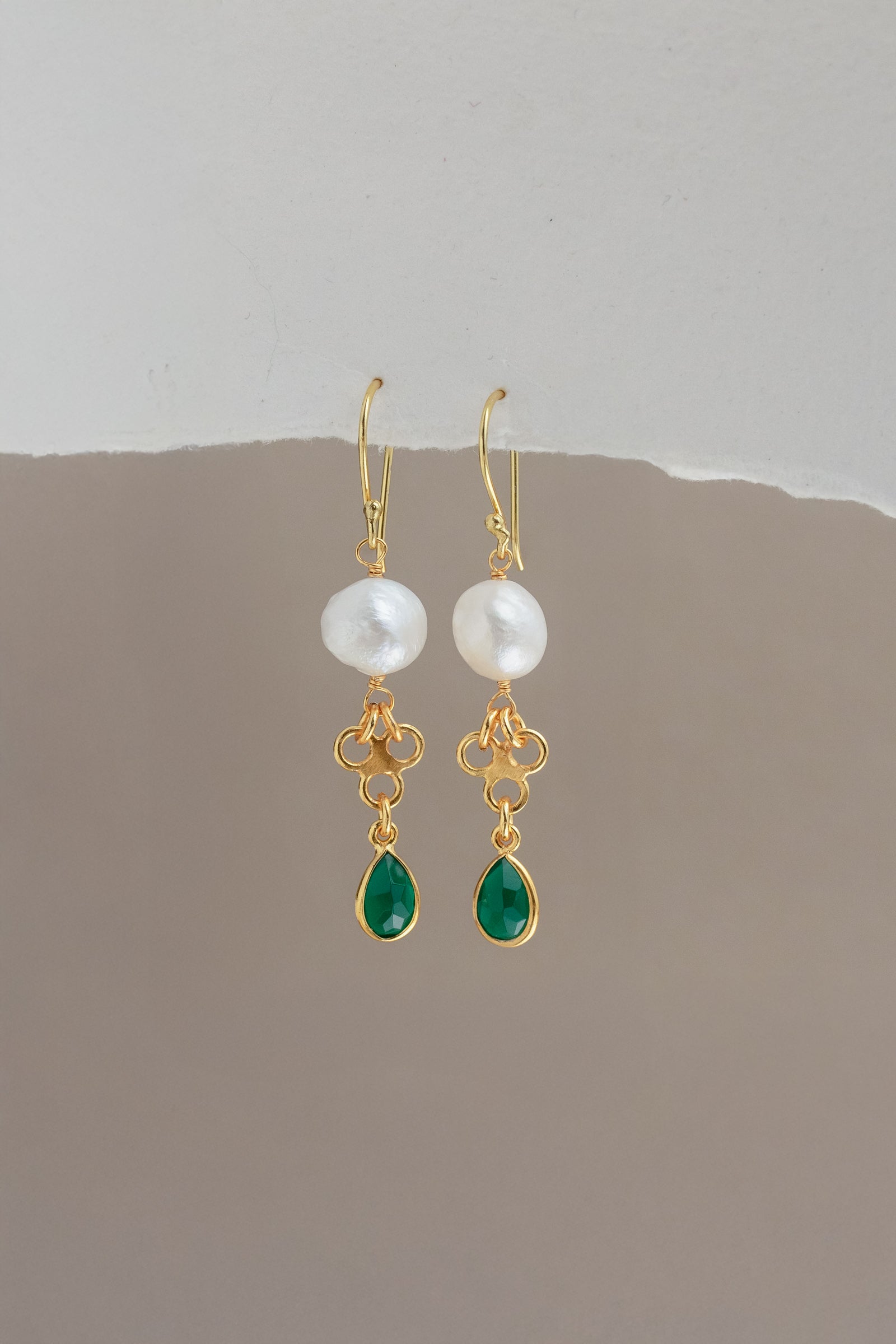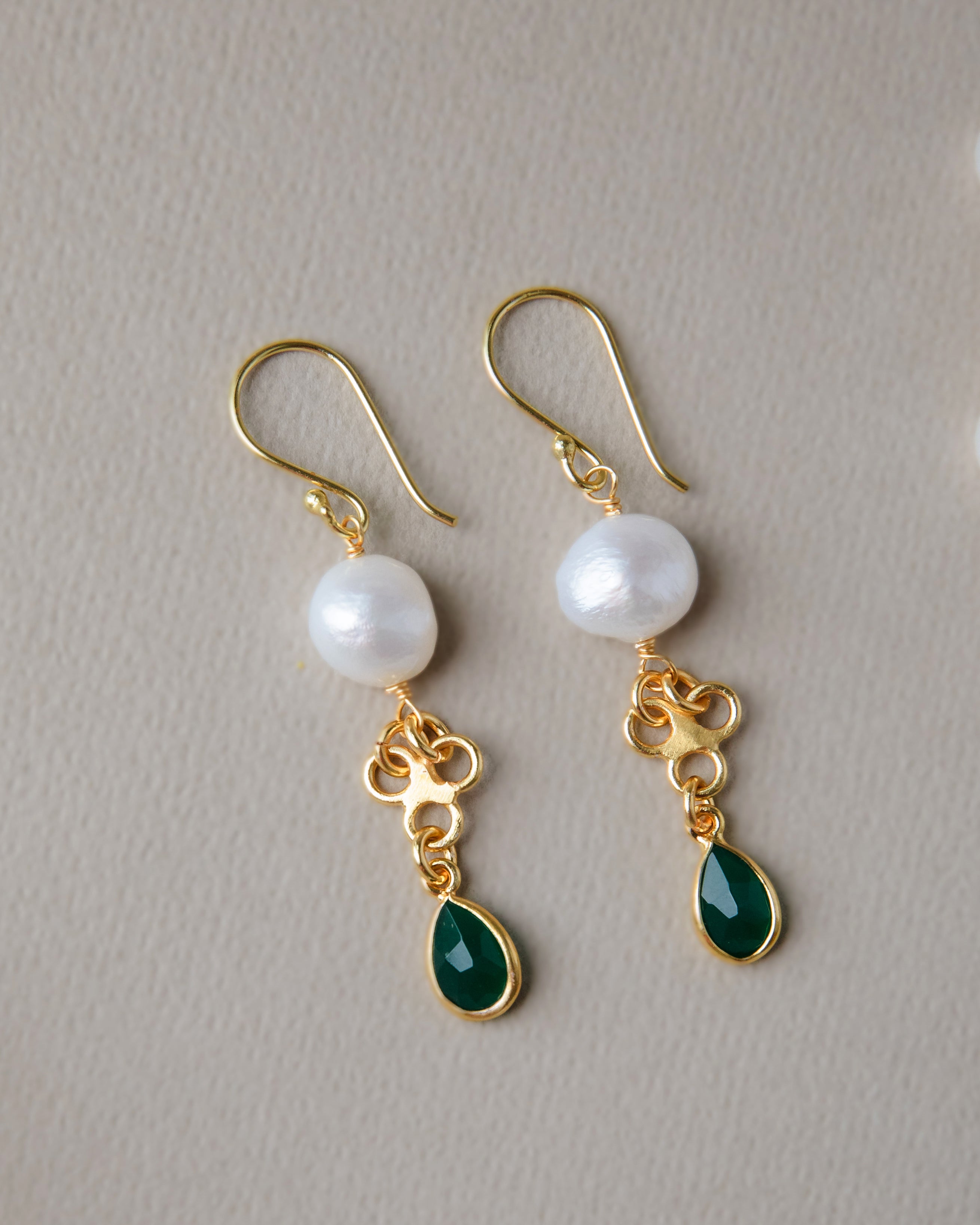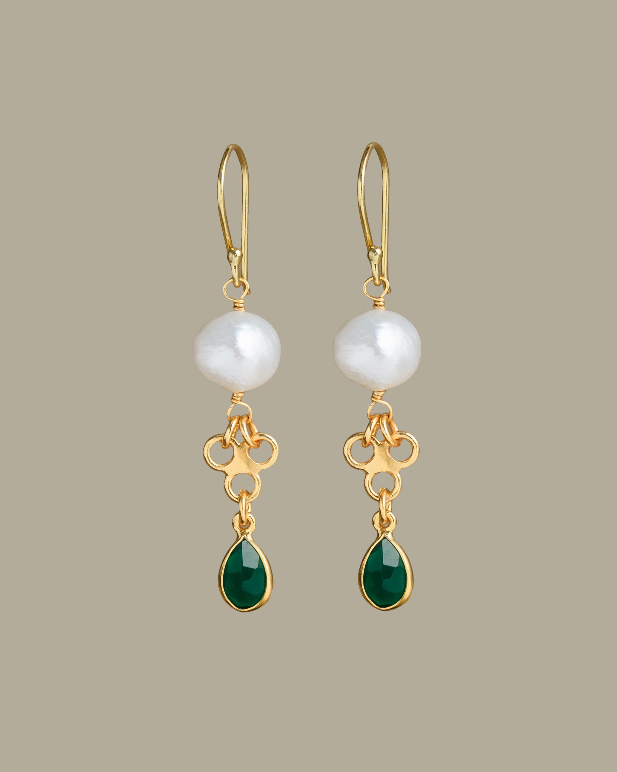 Faceted green onyx with vintage brass details and a natural freshwater pearl – bold yet elegant.