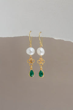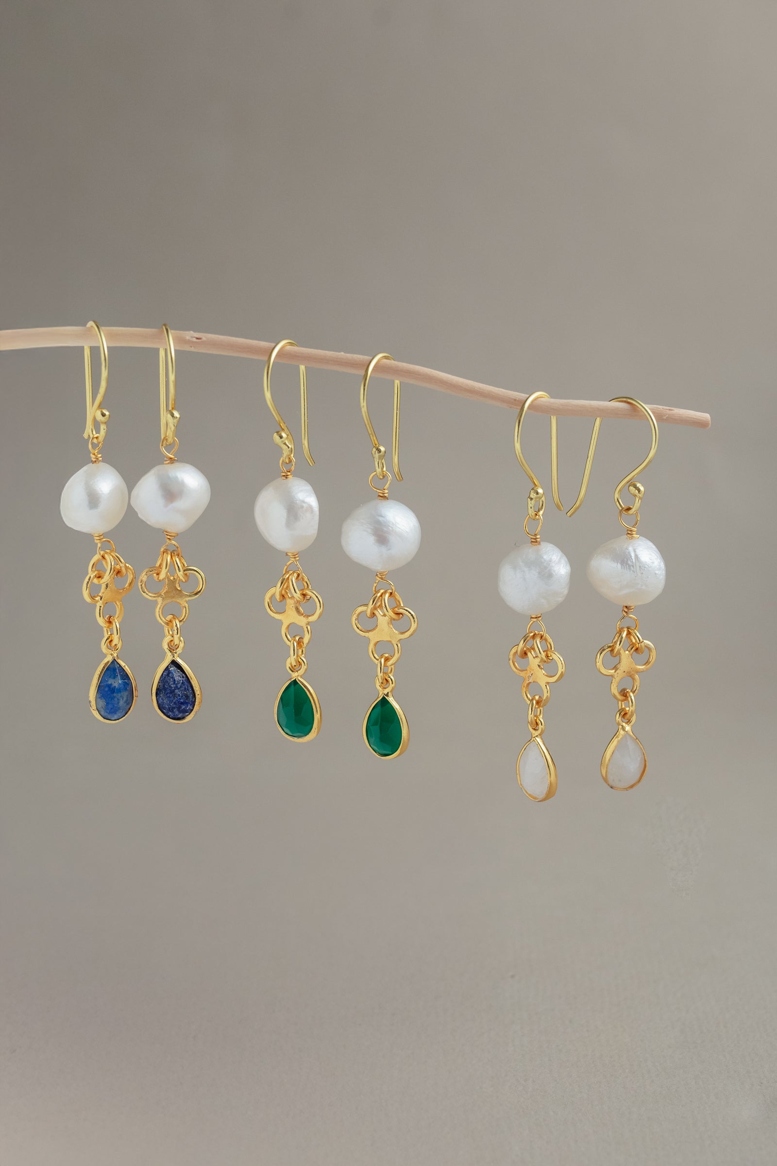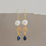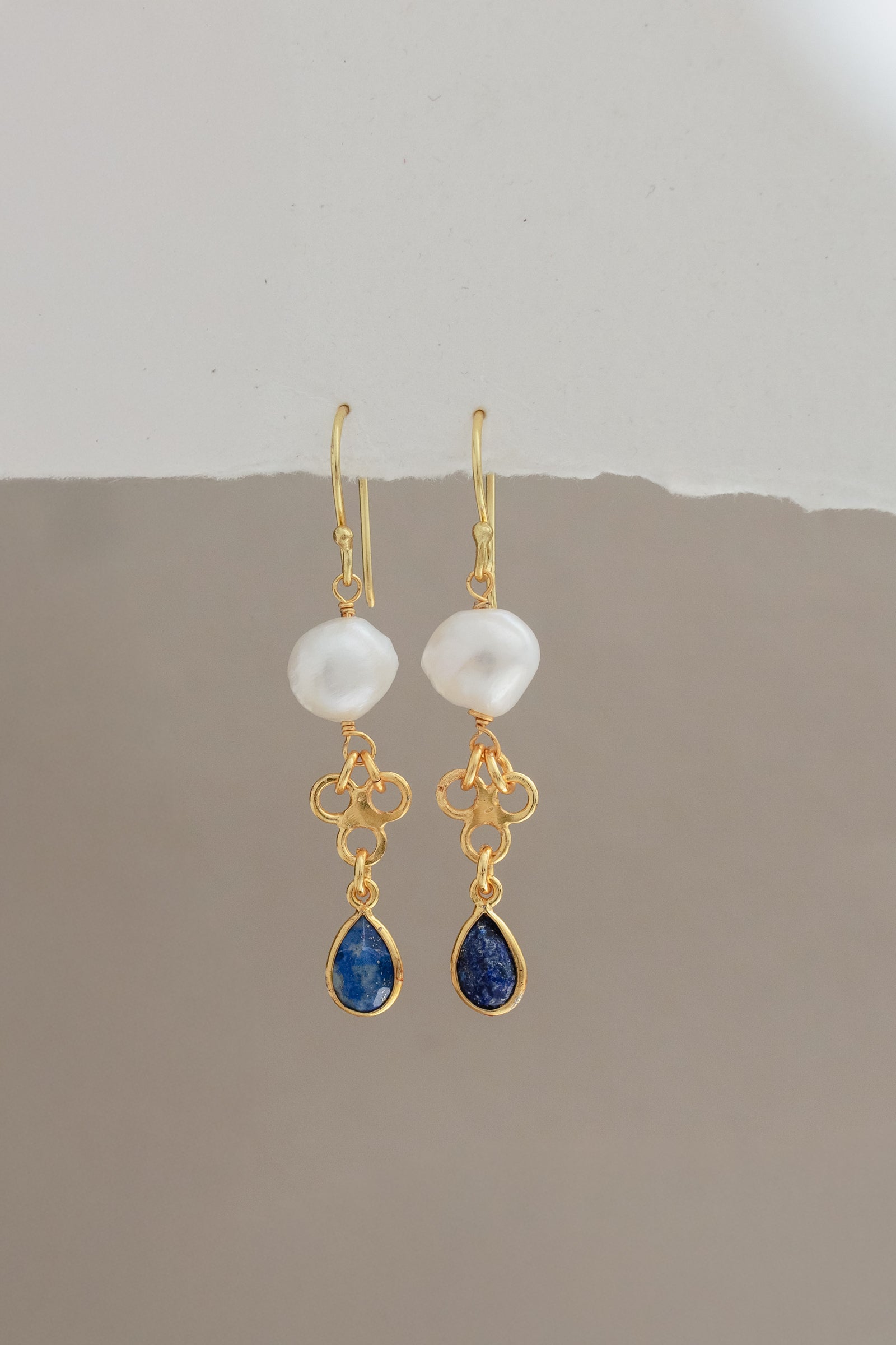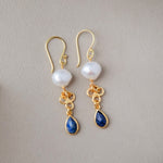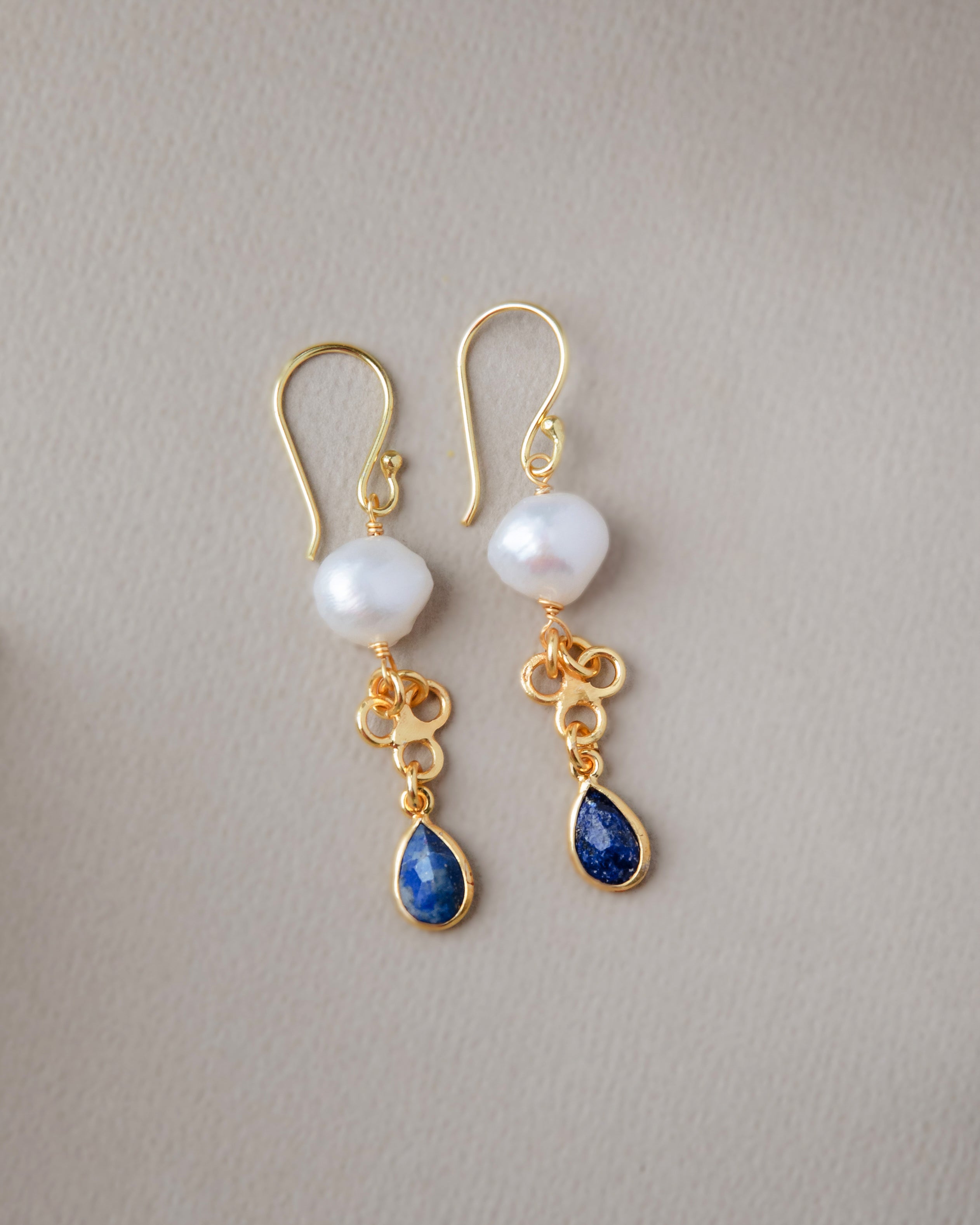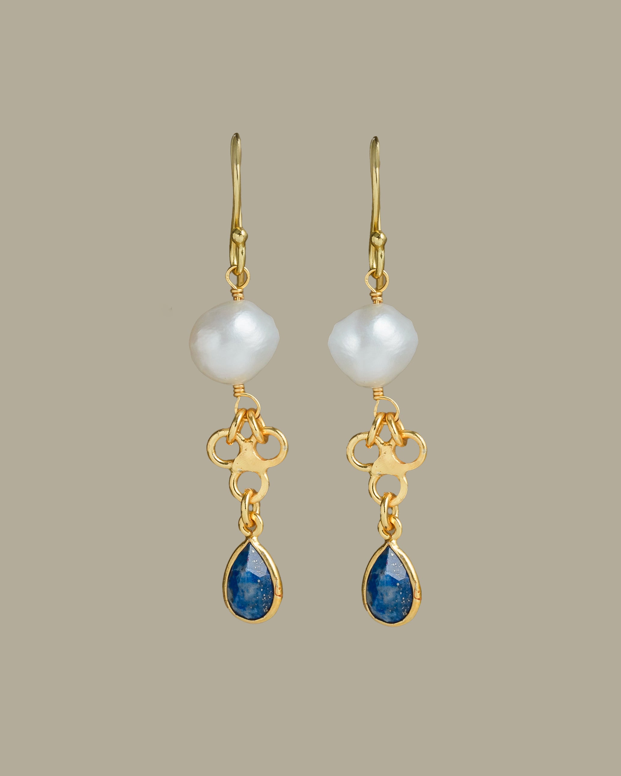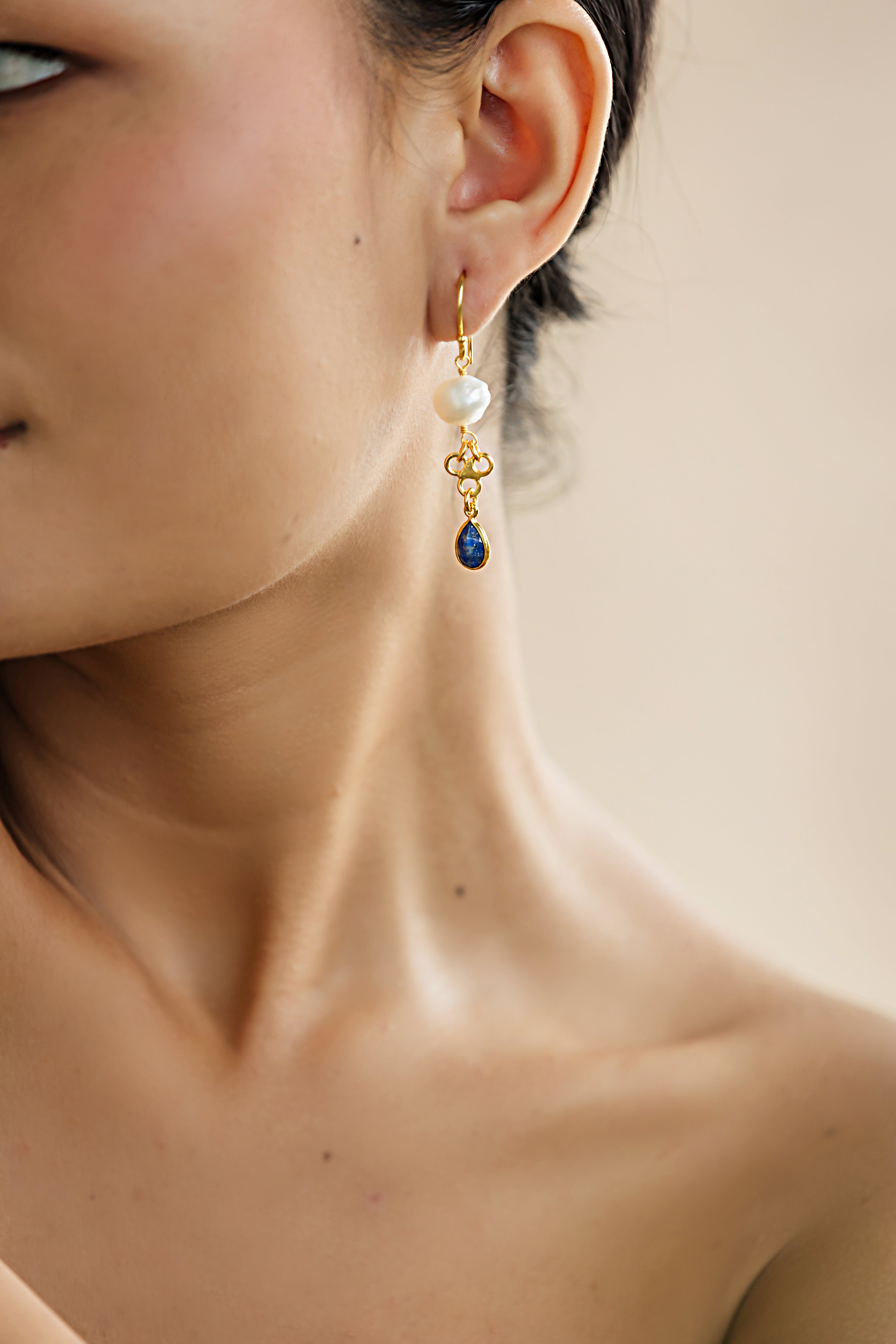A pear-shaped lapis drop paired with vintage-inspired detailing and a natural freshwater pearl. Classic yet unique.