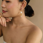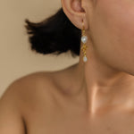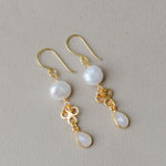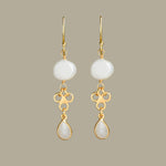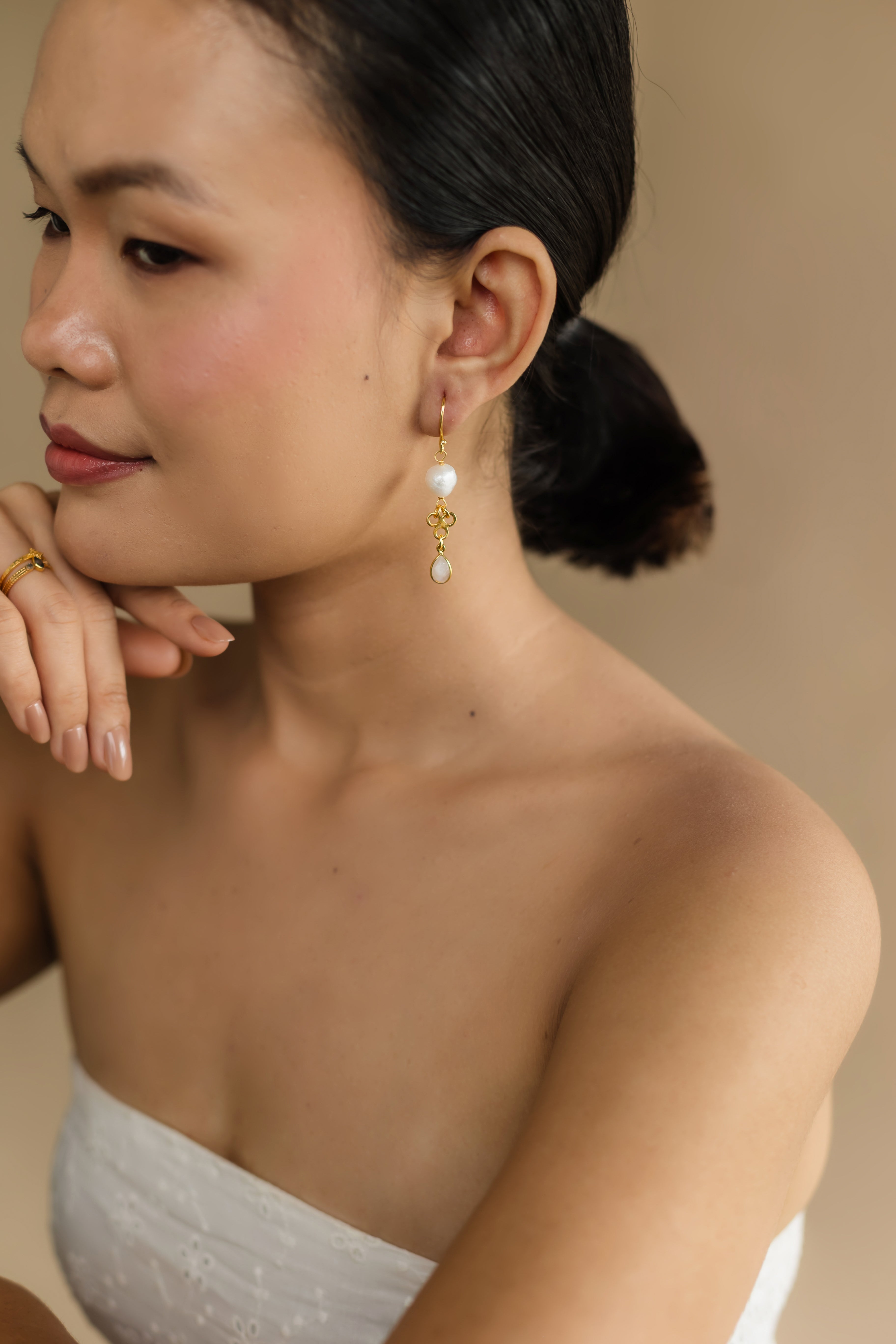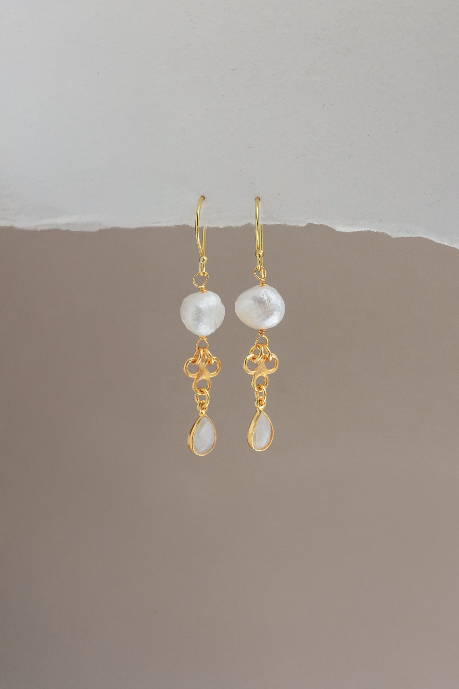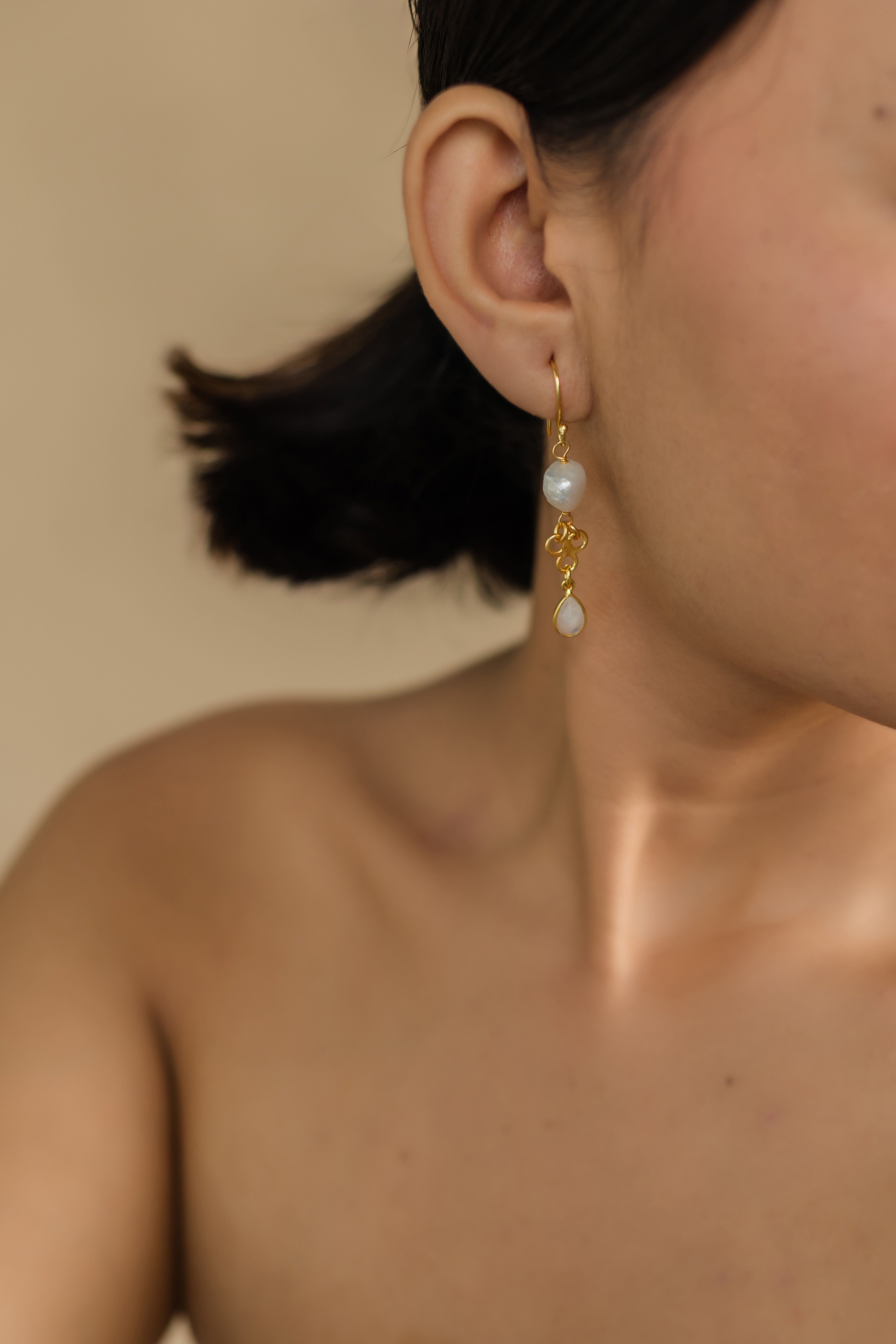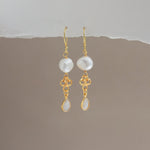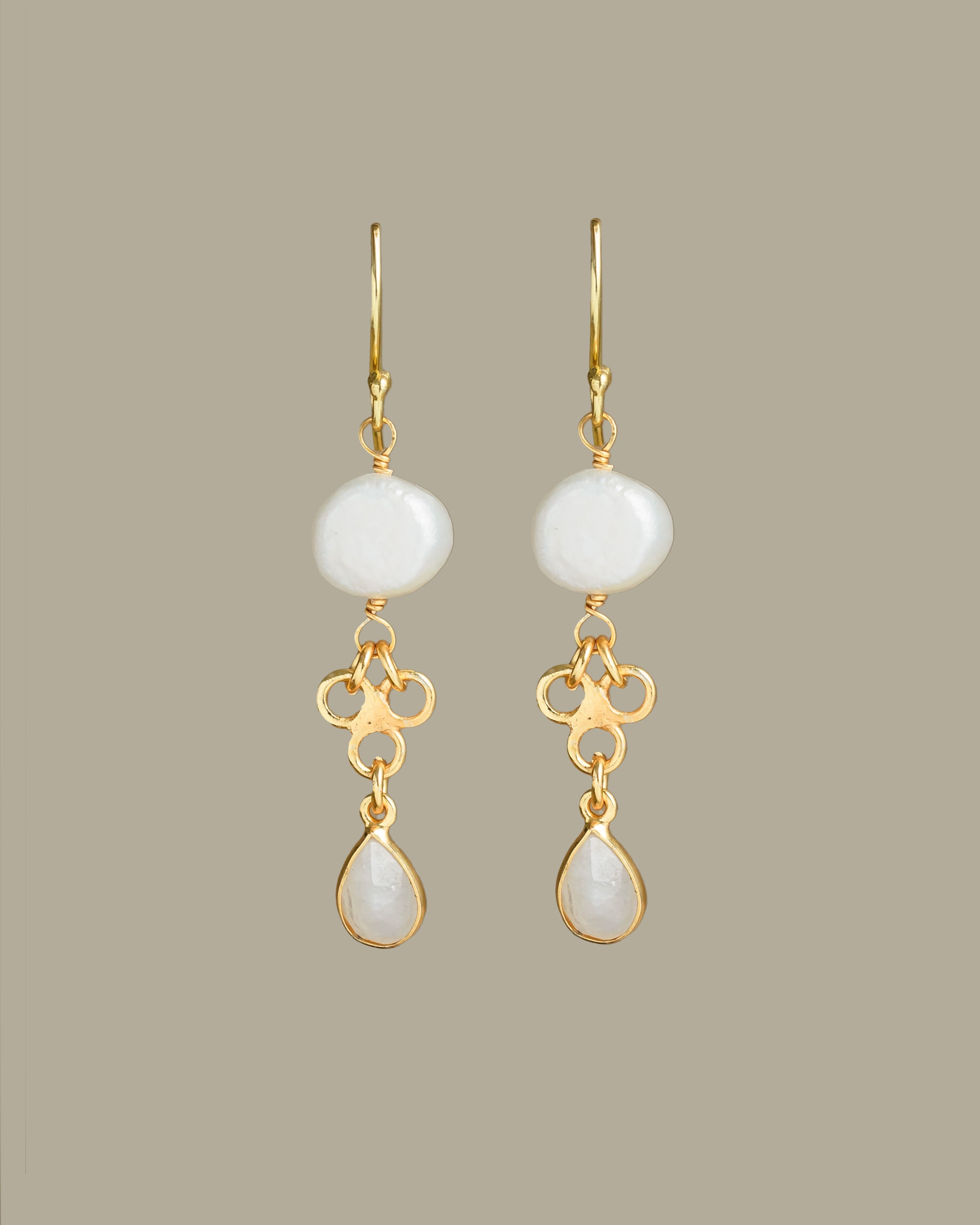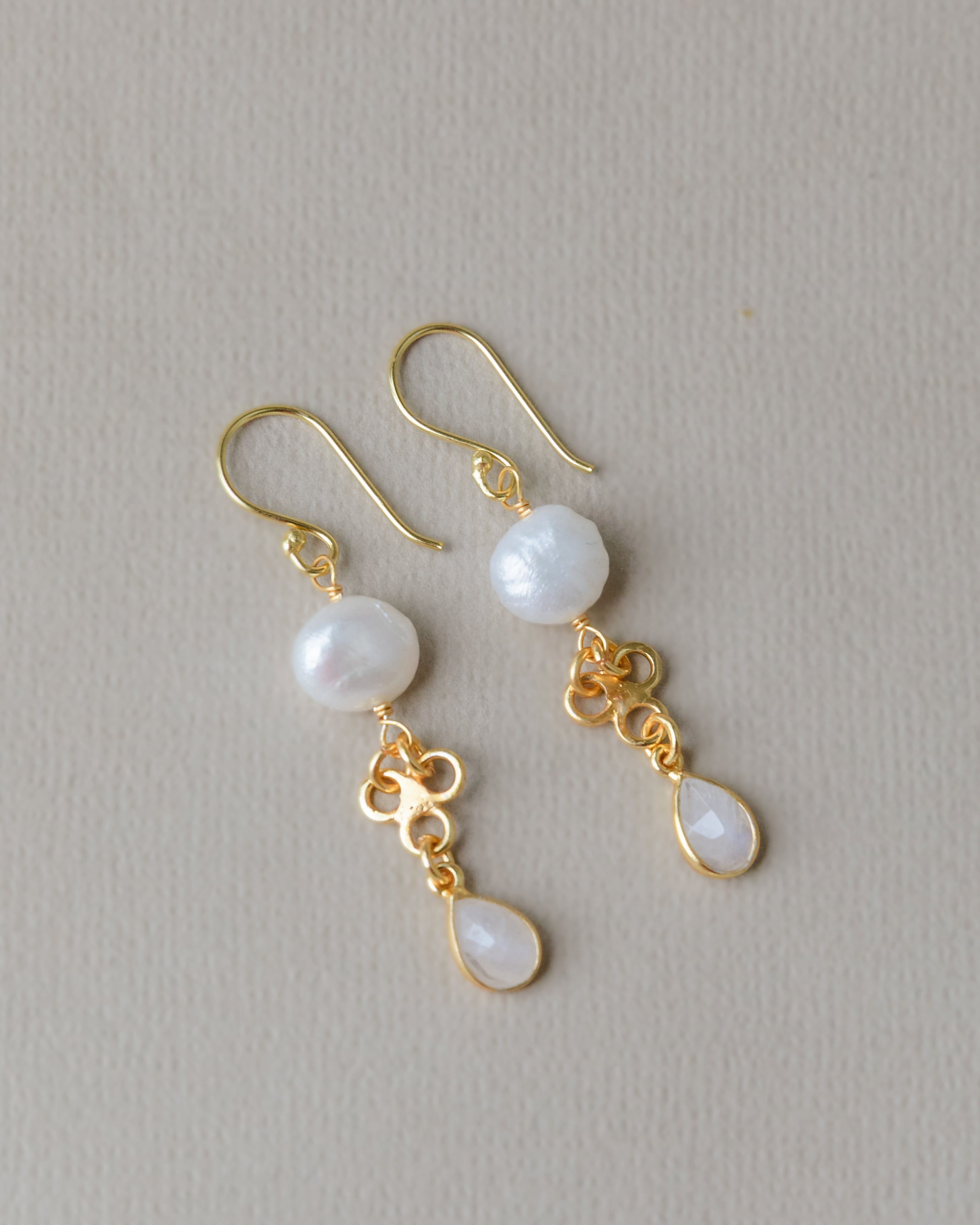 Glowing moonstone framed with delicate brass details and a freshwater pearl accent.