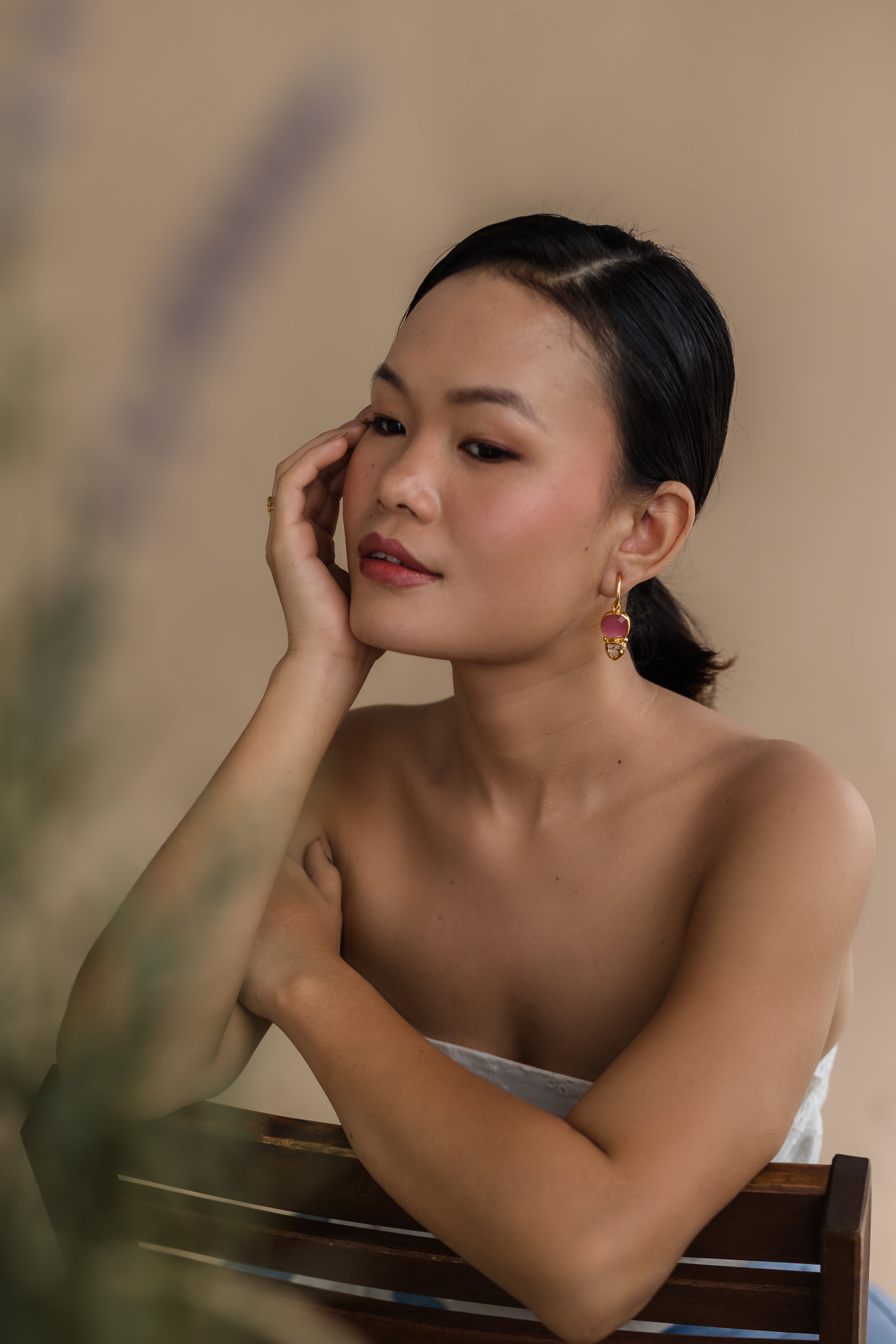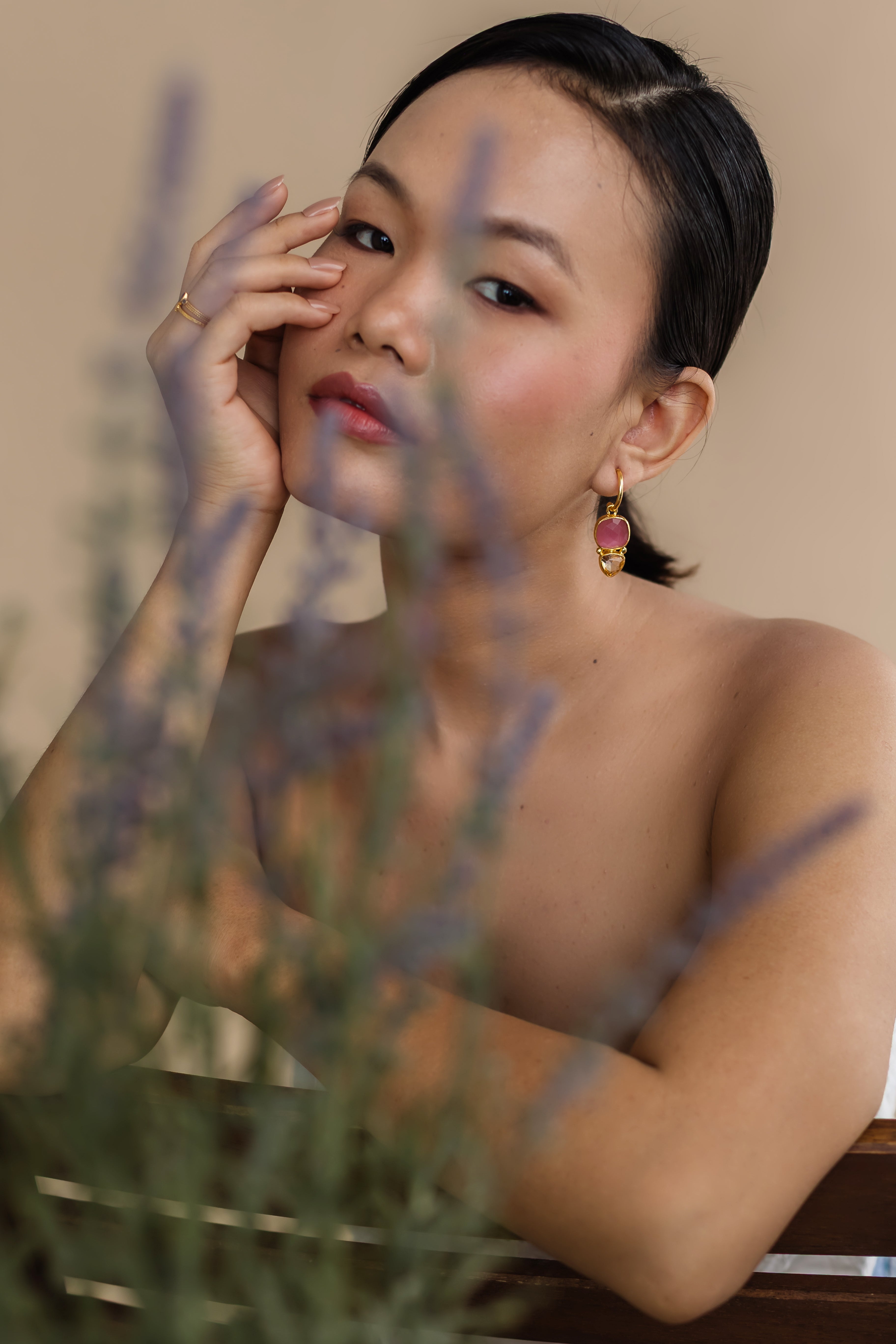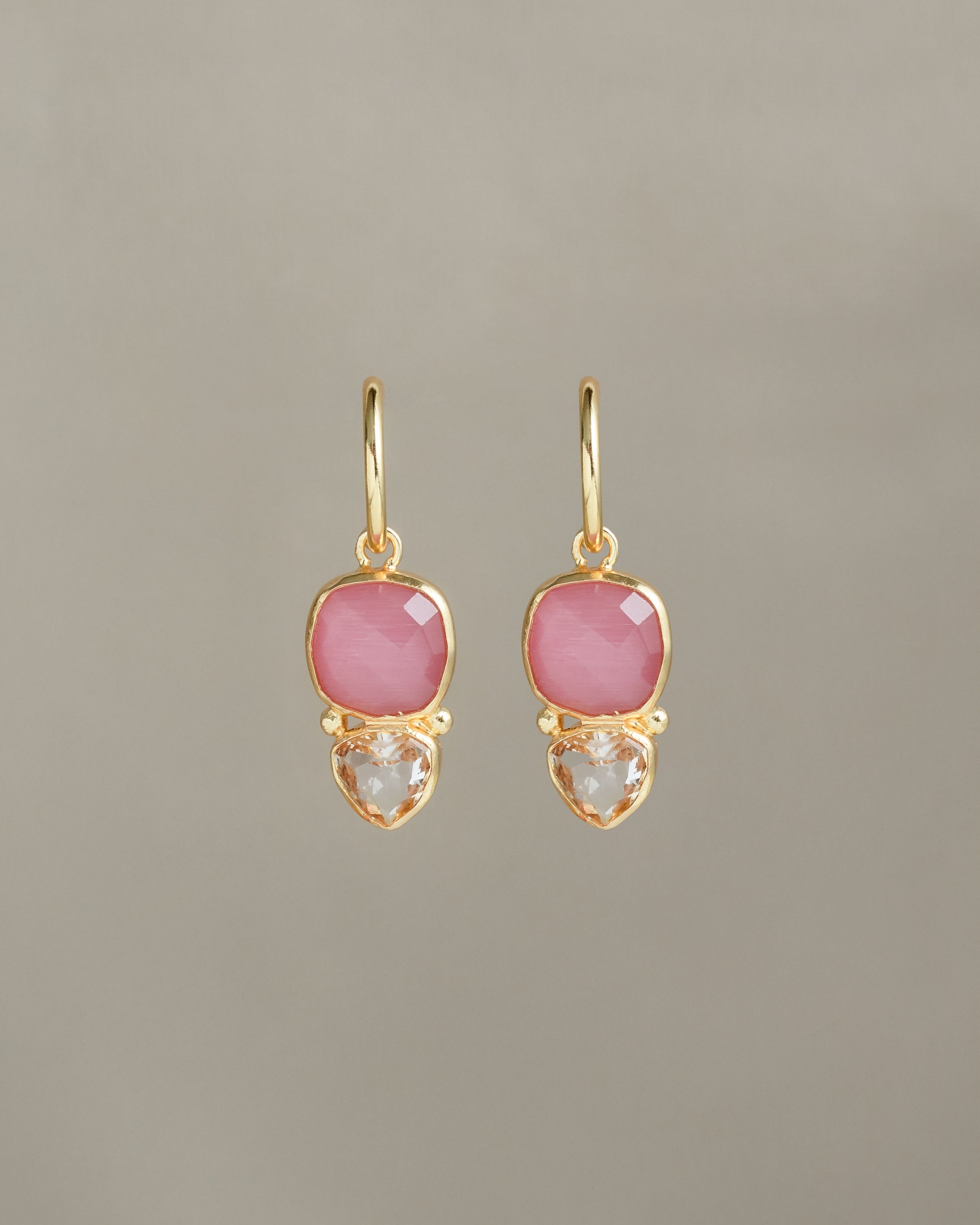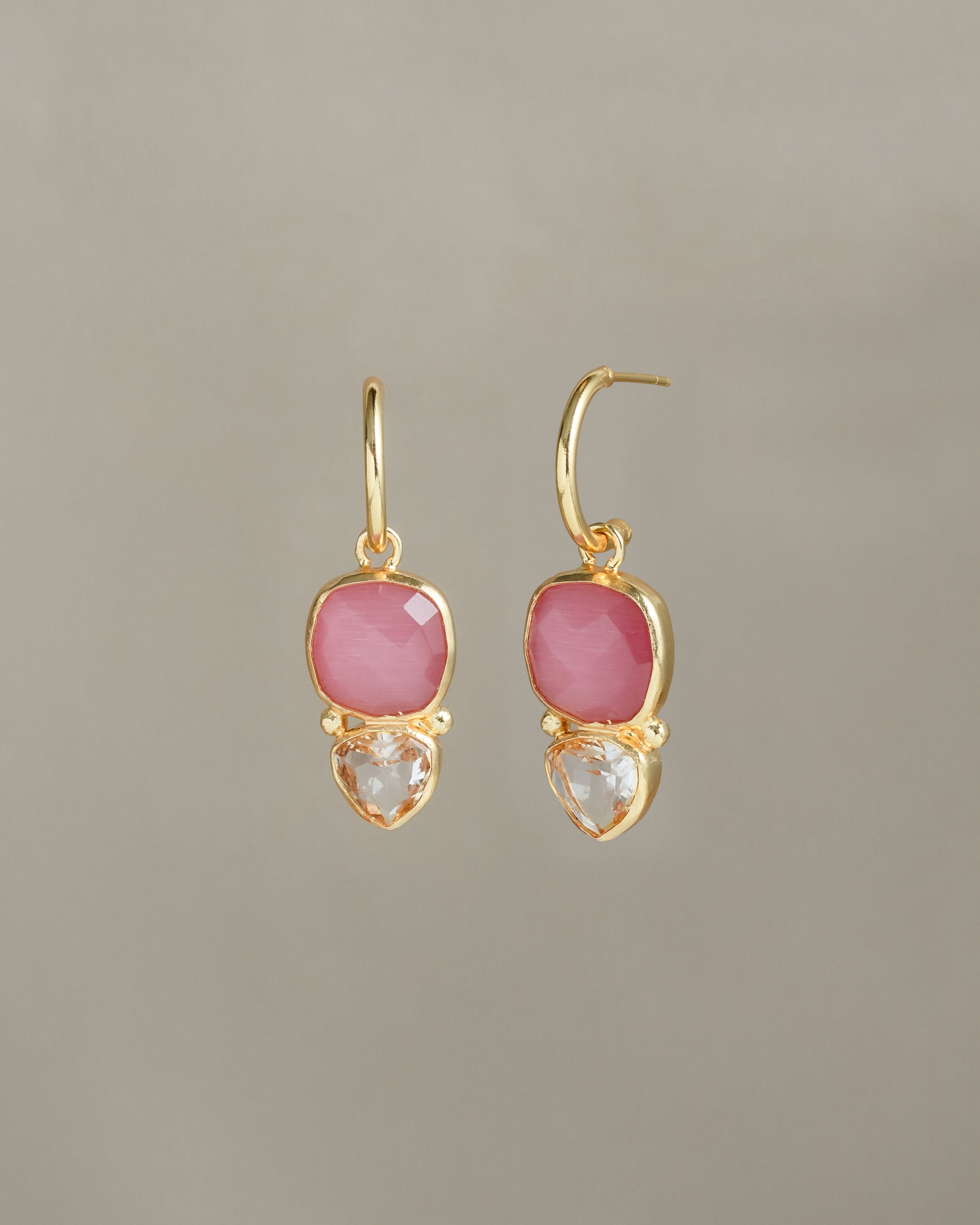 A playful combination of pink onyx and topaz in a geometric hoop stud – bold yet graceful.