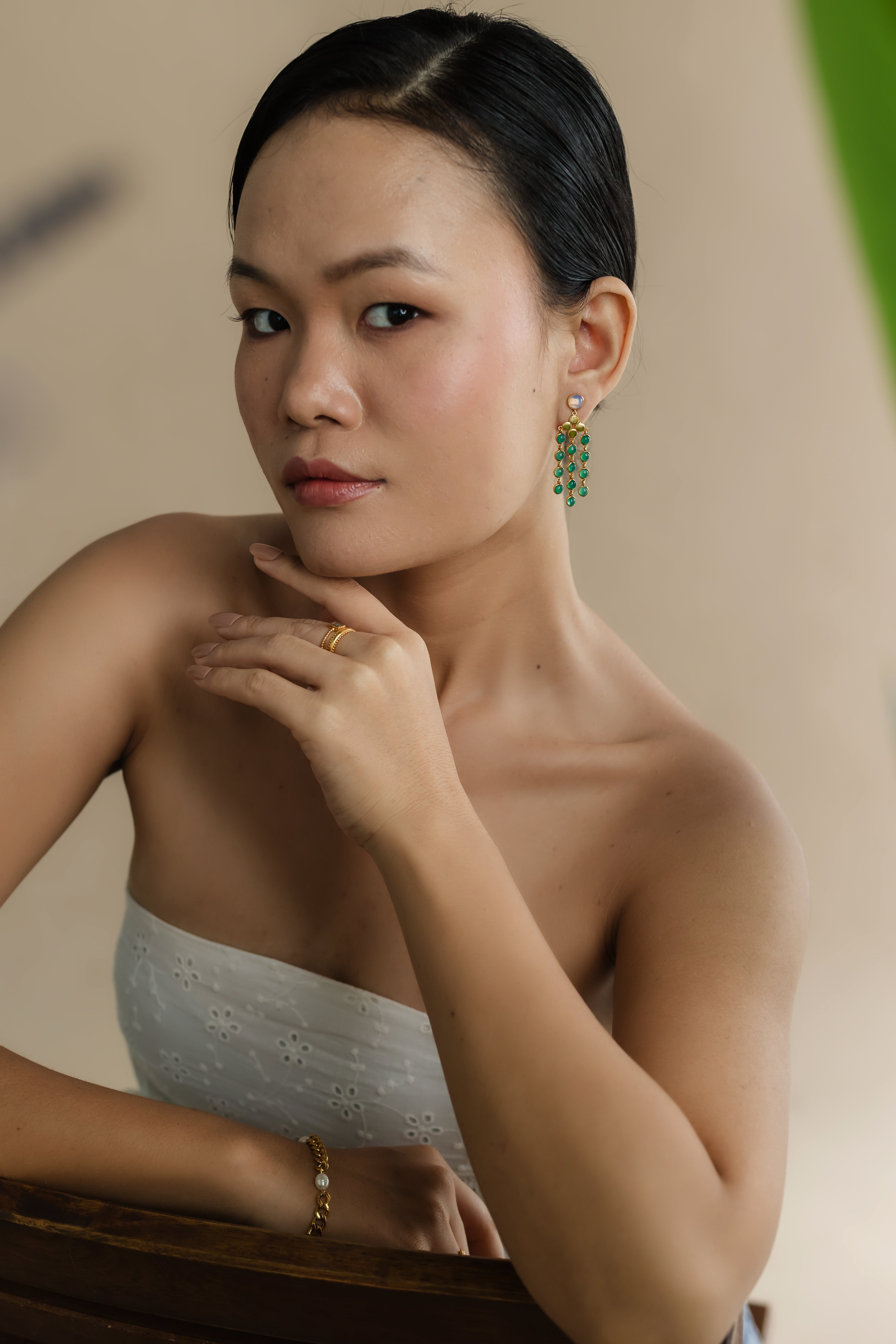 Shimmering opalite meets striking emerald onyx in this handcrafted design. A melody of stones and brass for a statement look that feels light and effortless.