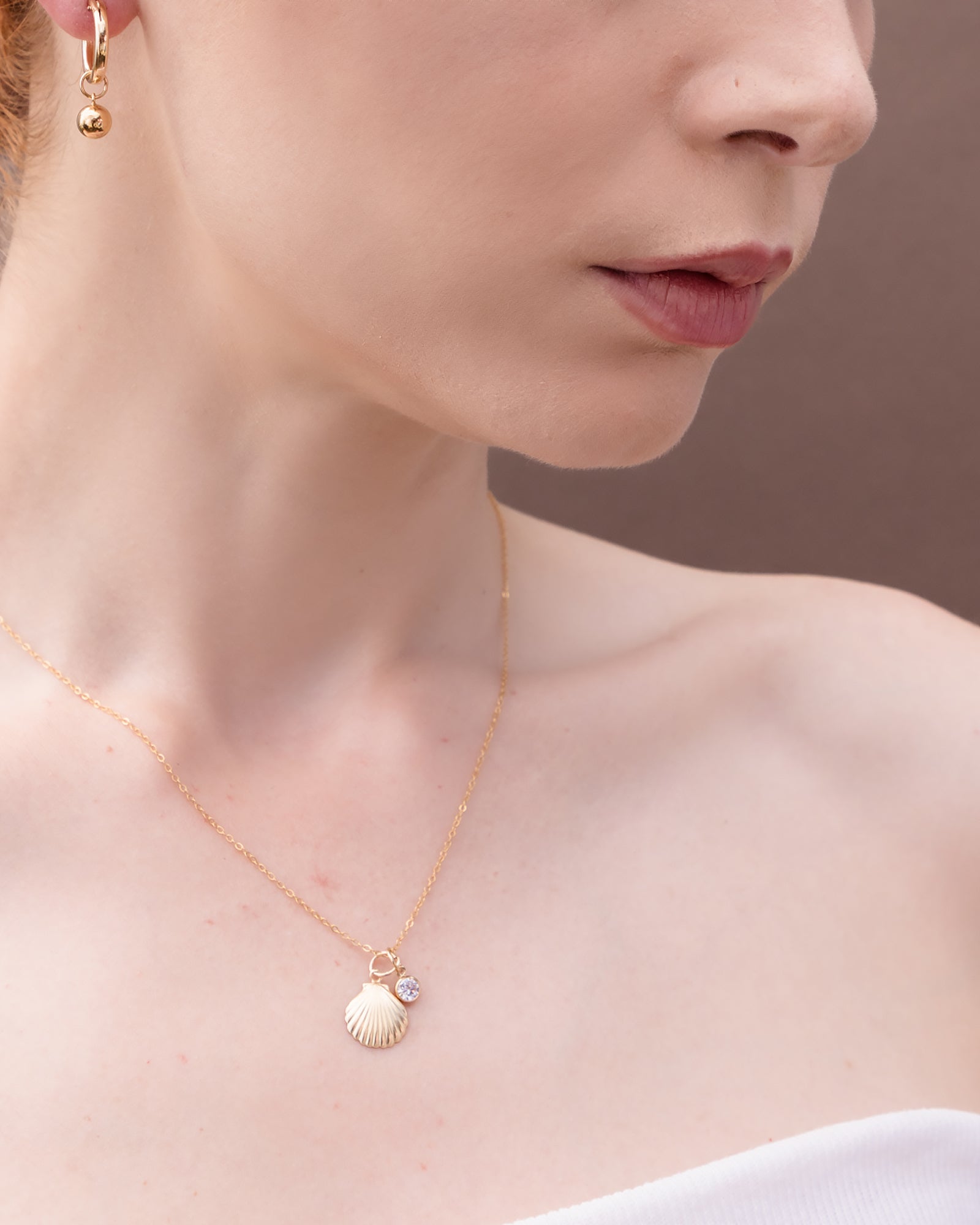 Measurements : Necklace : 16”(1.3MM) Charm : Zirconia : 4mm, Seashell : 11mm