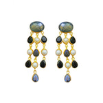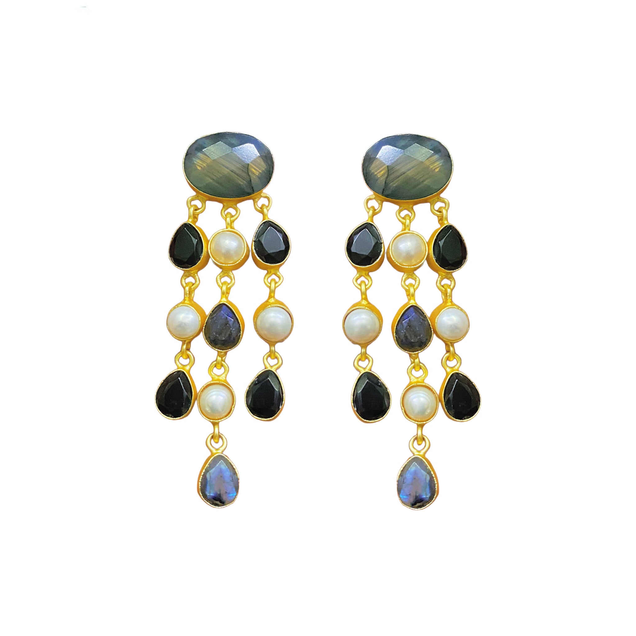 Our waterfall earrings in freshwater pearl, labradorites and black onyx is the ultimate statement piece. This fluid, luminous and stunning earring is handcrafted in 18k brass.