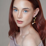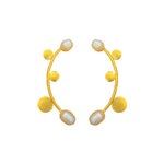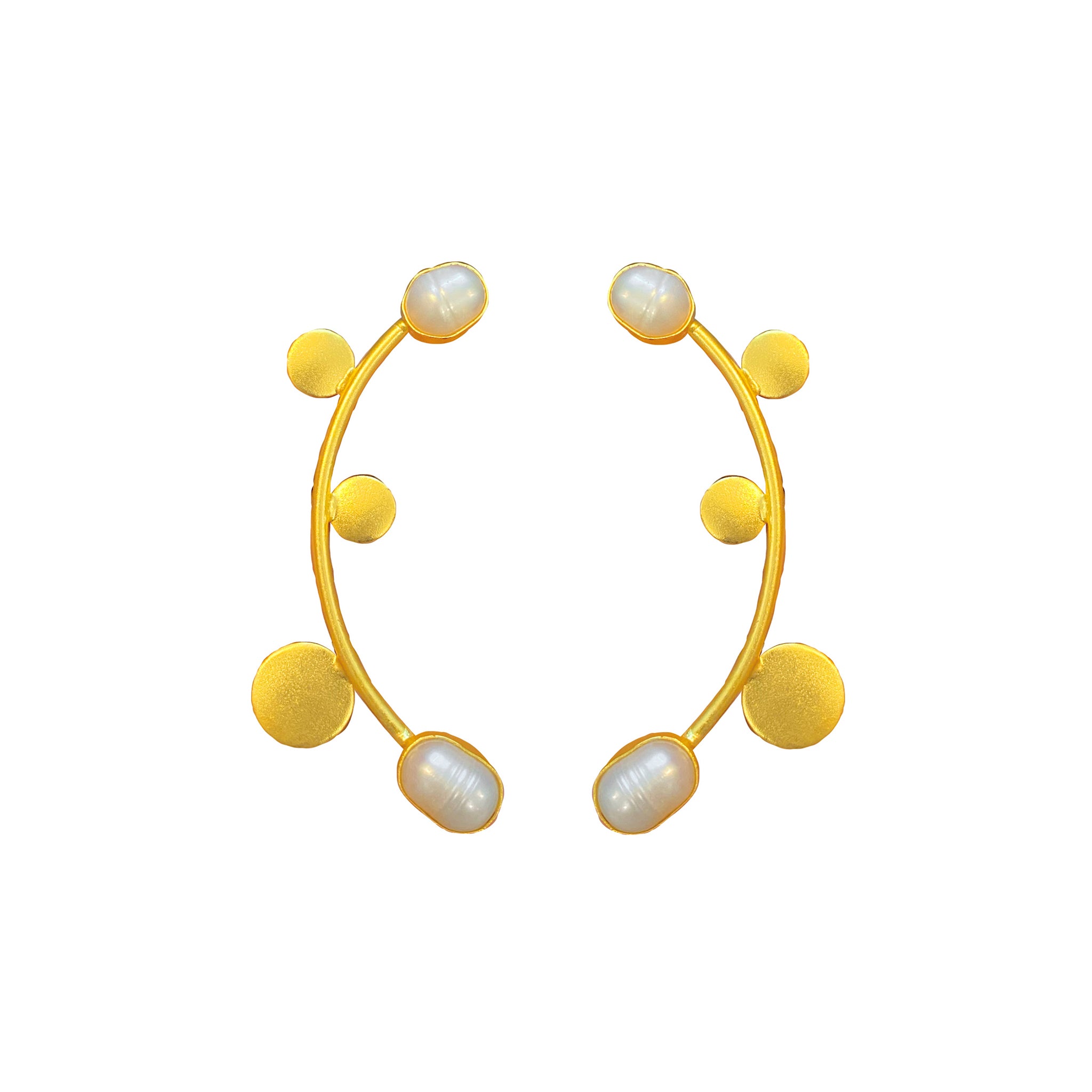 Each earring features lustrous pearls on either end of a sleek brass metal arc, forming an elegant and eye-catching silhouette.