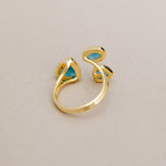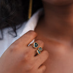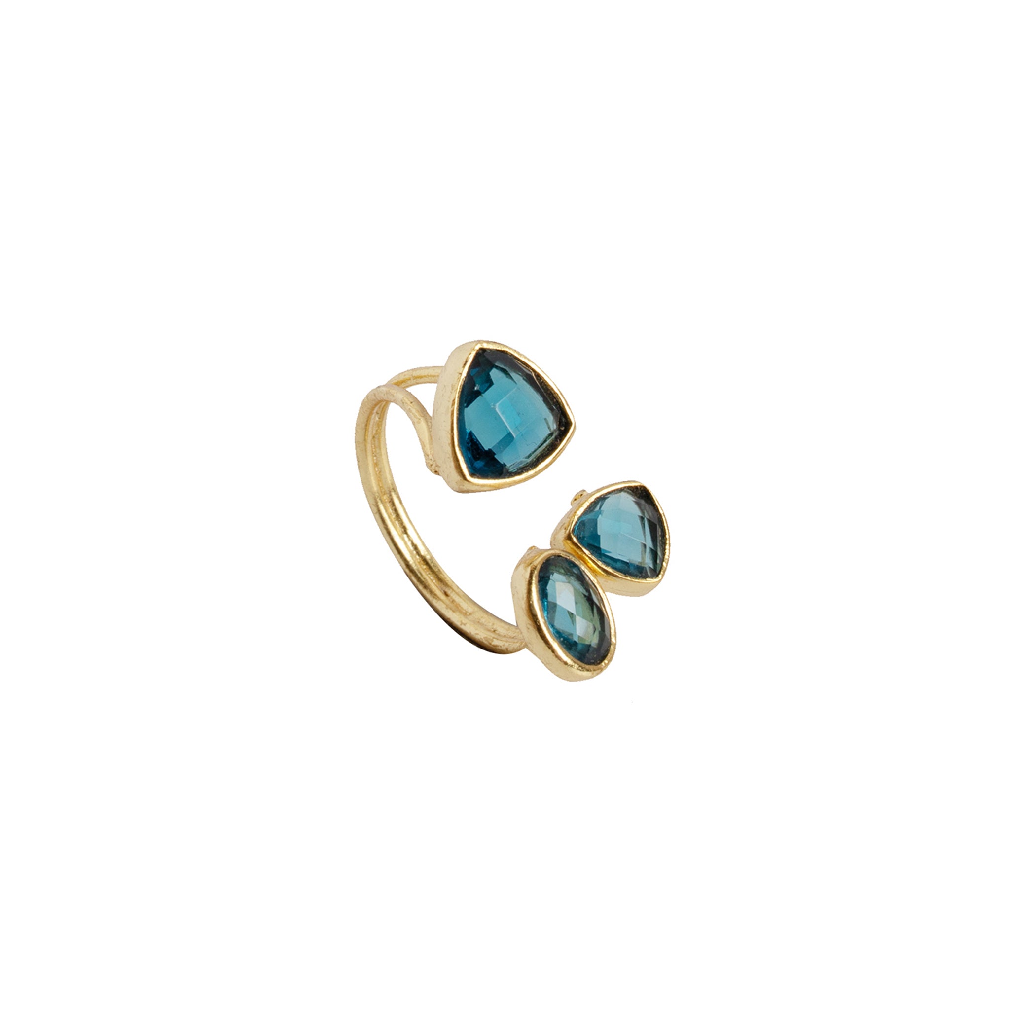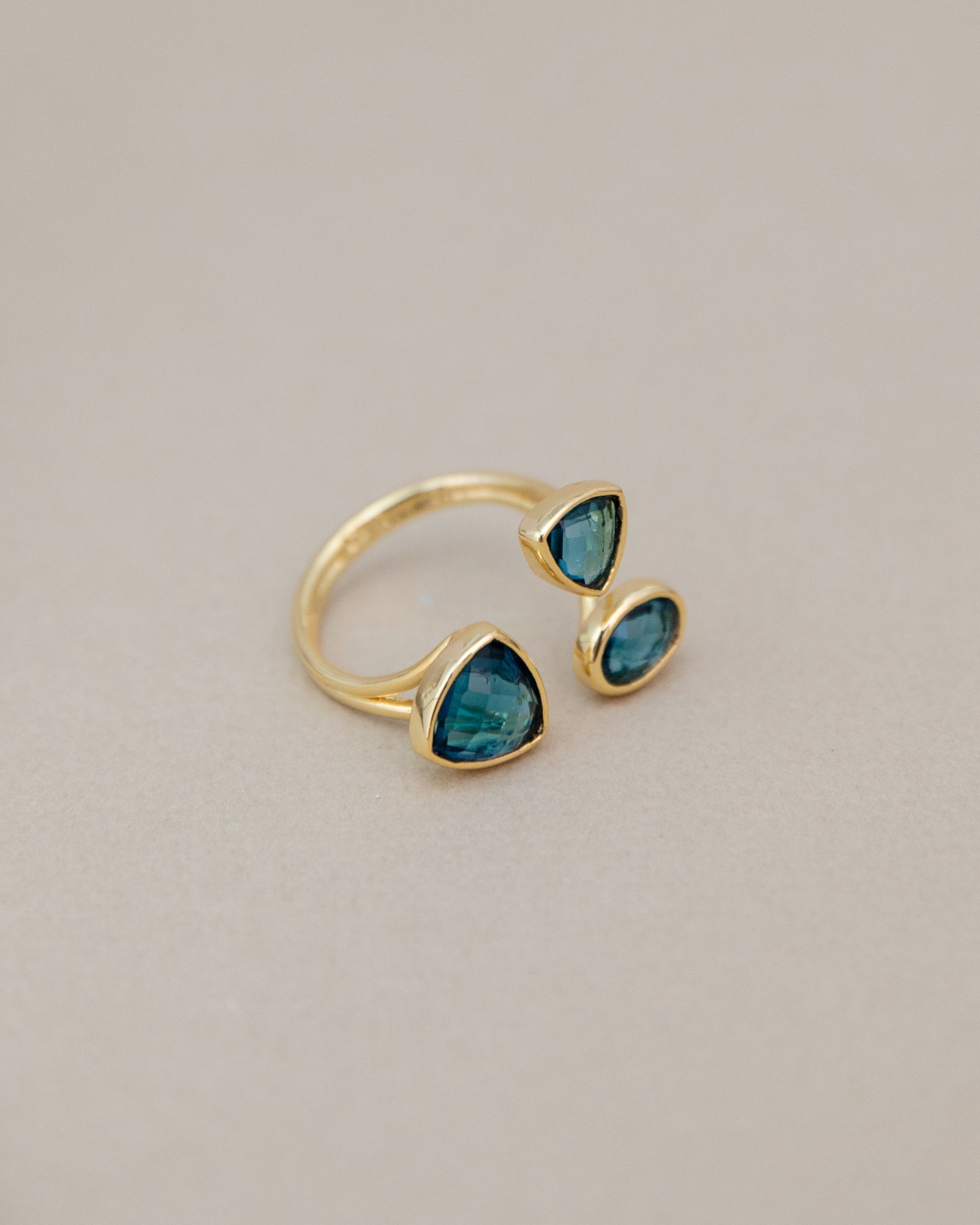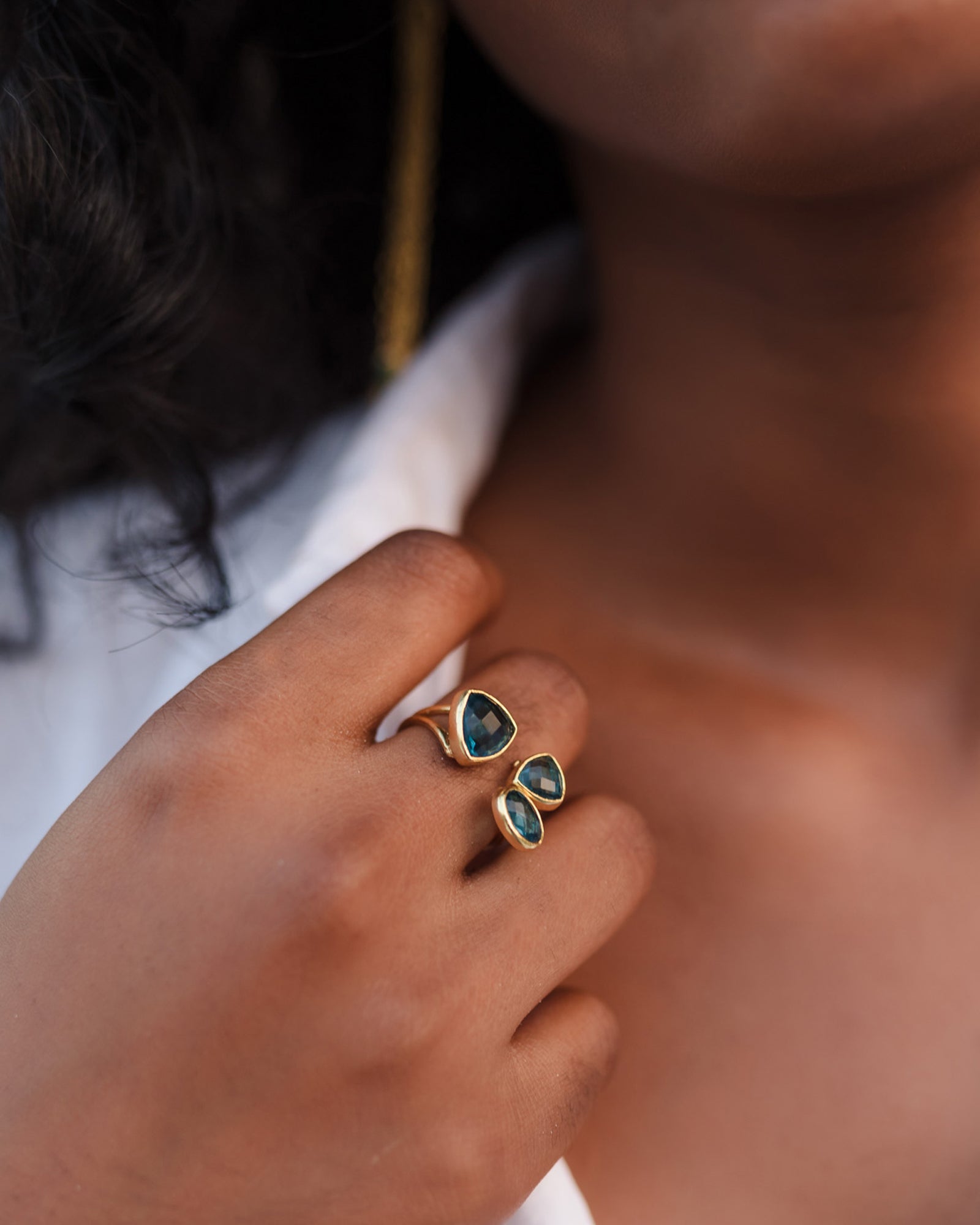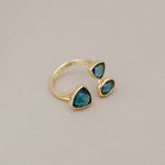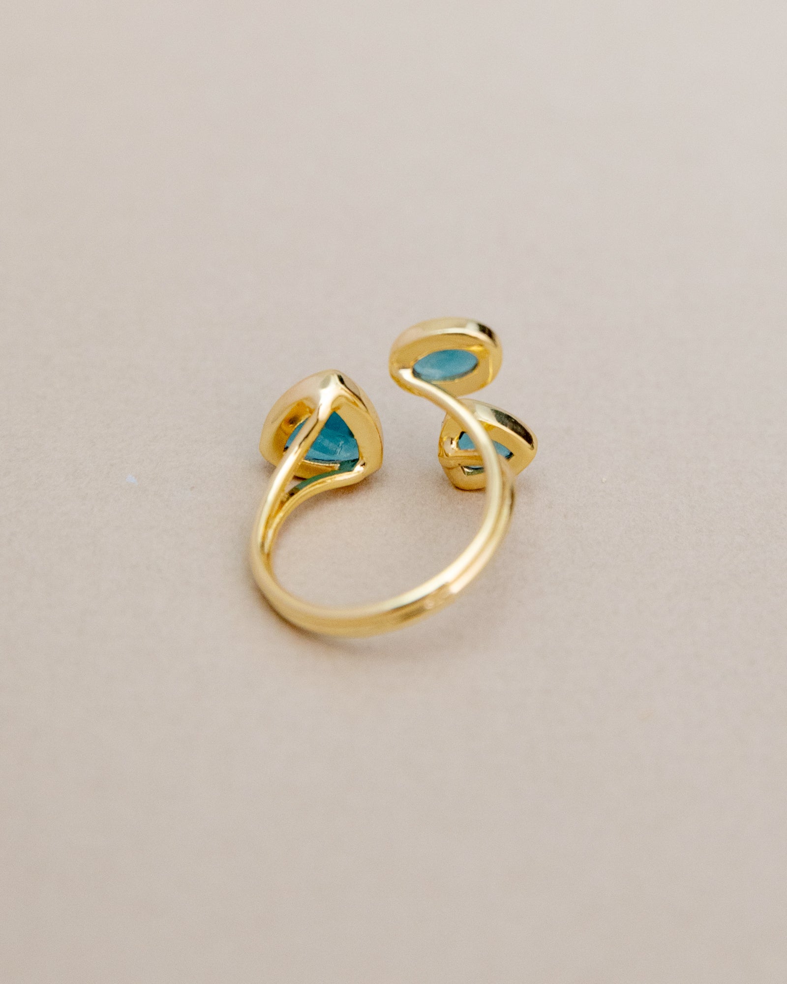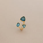 This three-stone adjustable ring in flourite features three stunning sapphire onyx stones in a stunning bezel setting. You'll love the versatility and elegance this ring brings to your jewelry collection.