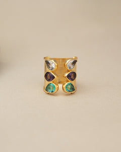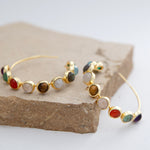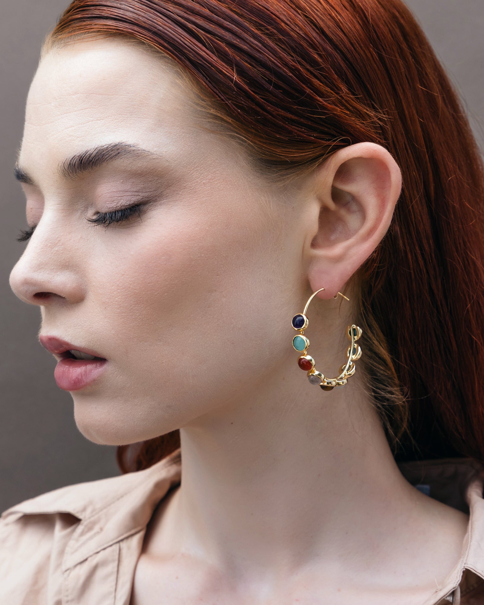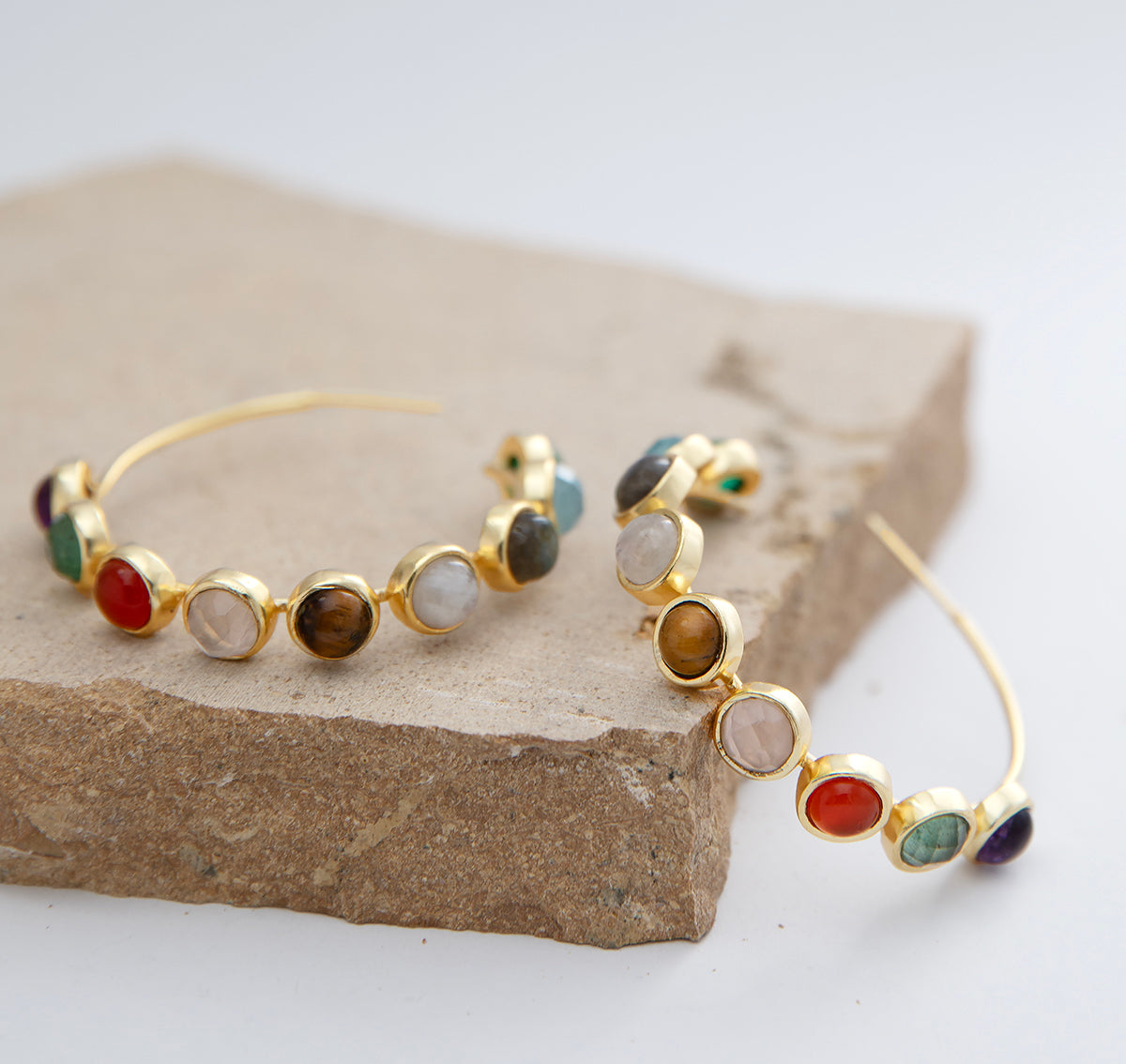 Introducing our Lago gemstone hoops  a vibrant and eye-catching pair of earrings that showcase a delightful array of multi-coloured gemstones.