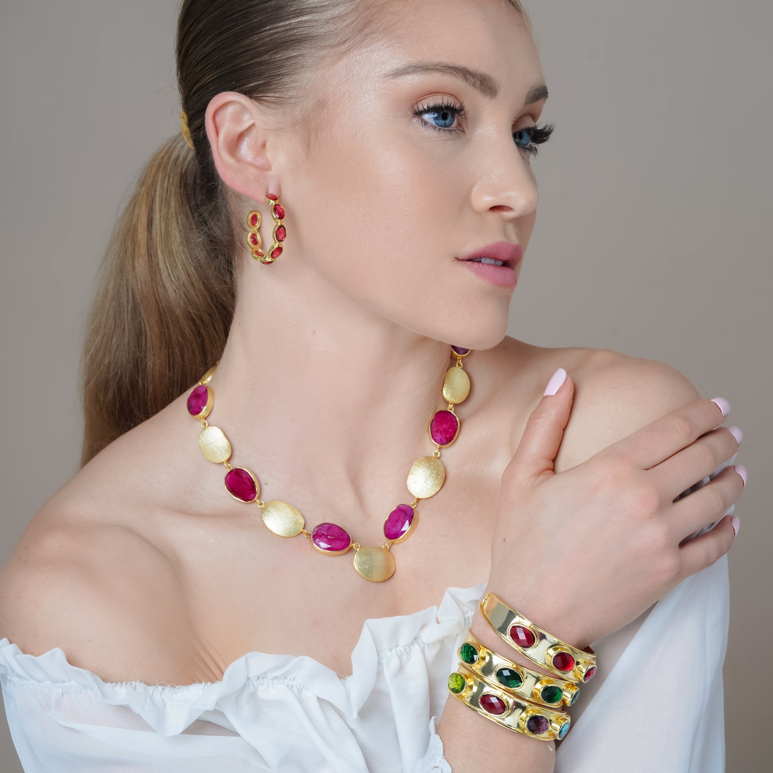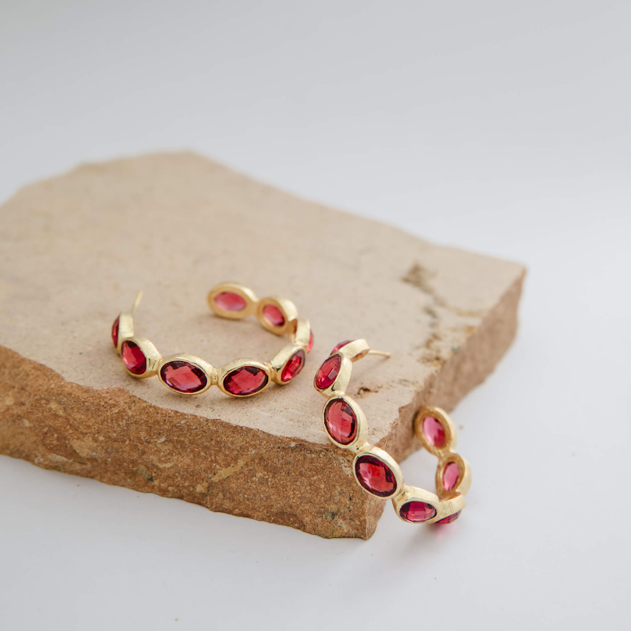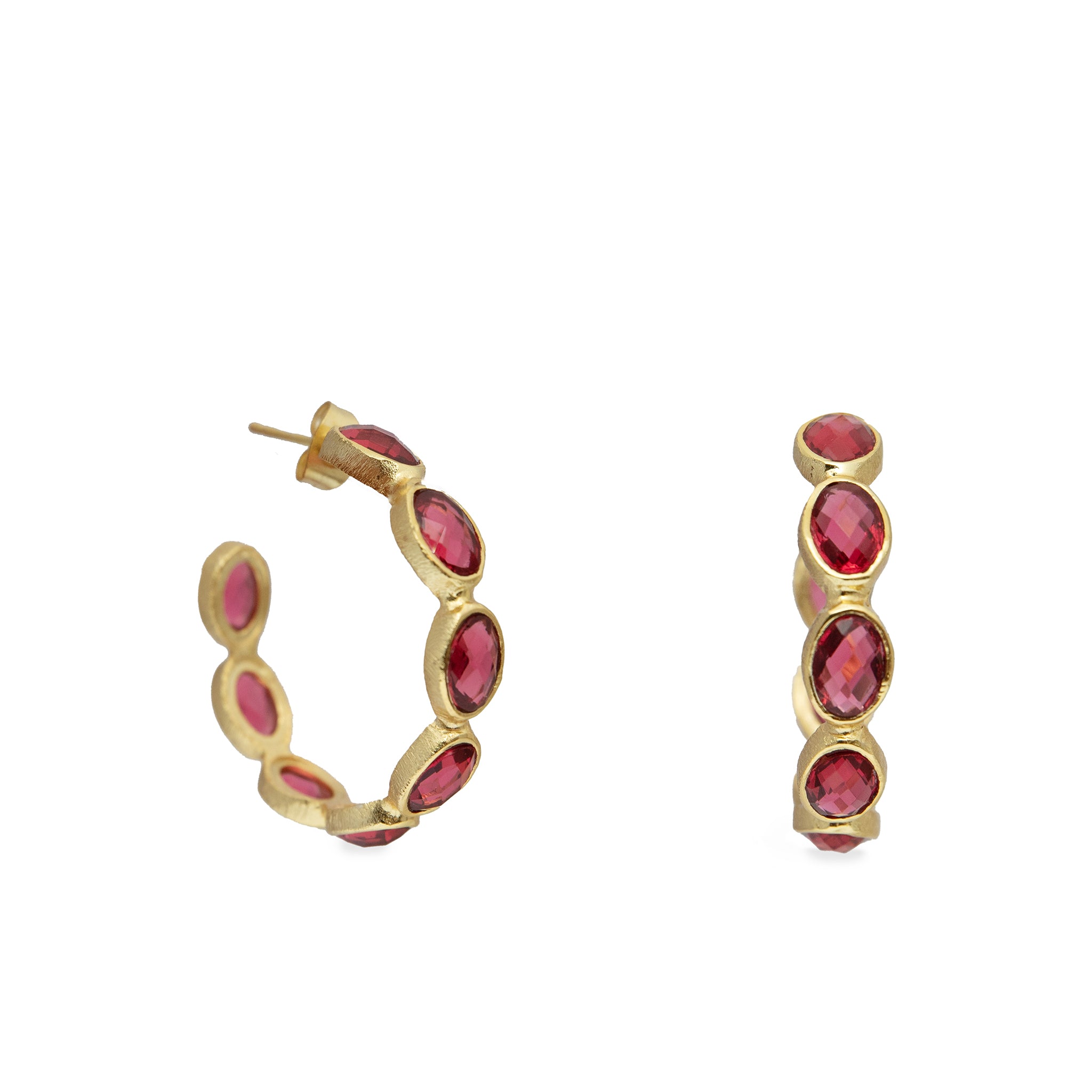 Crafted with precision, these hoops are designed for comfortable wear, allowing you to showcase the luxurious beauty of raspberry crystal in a versatile and stylish design. \