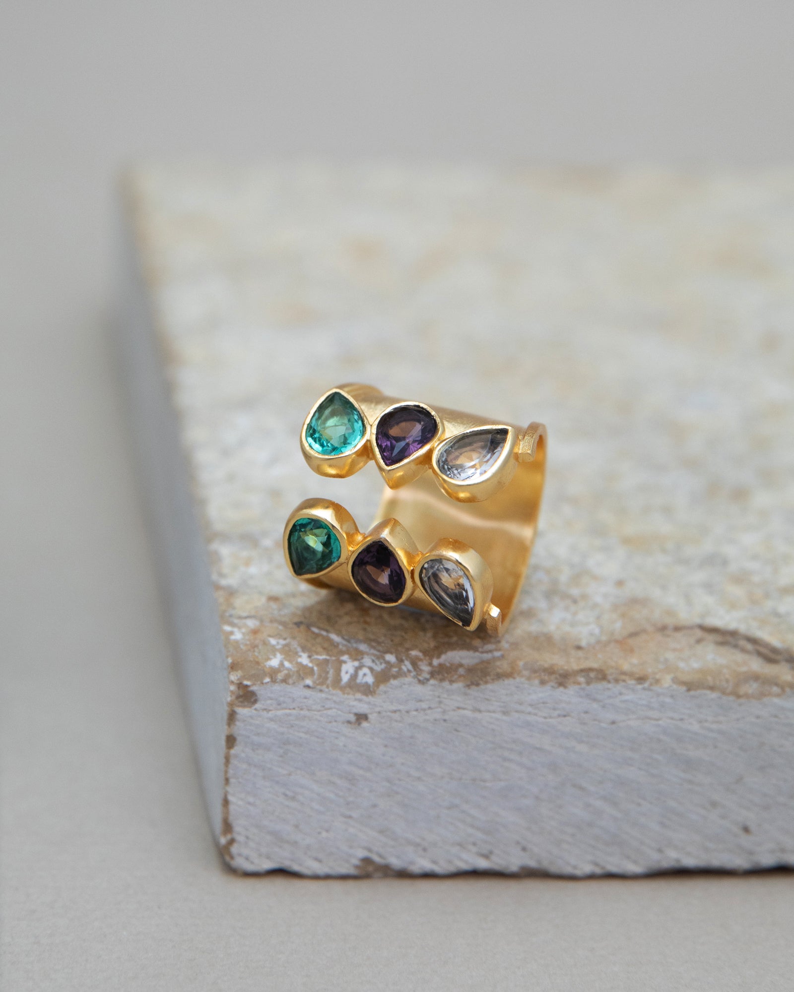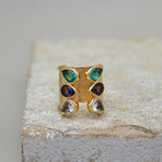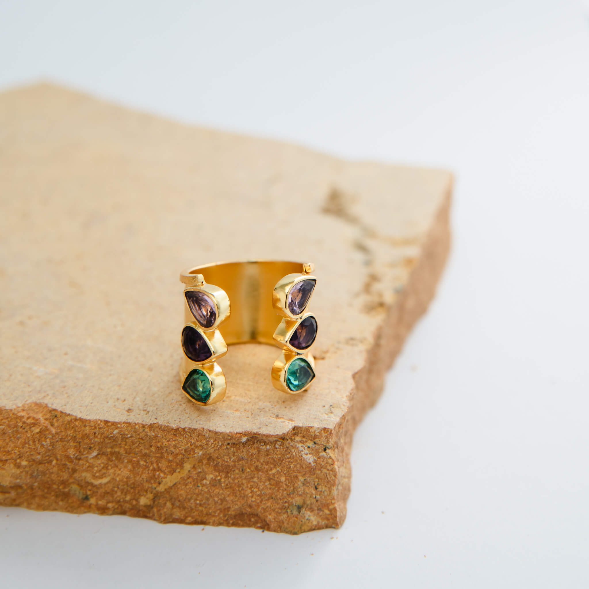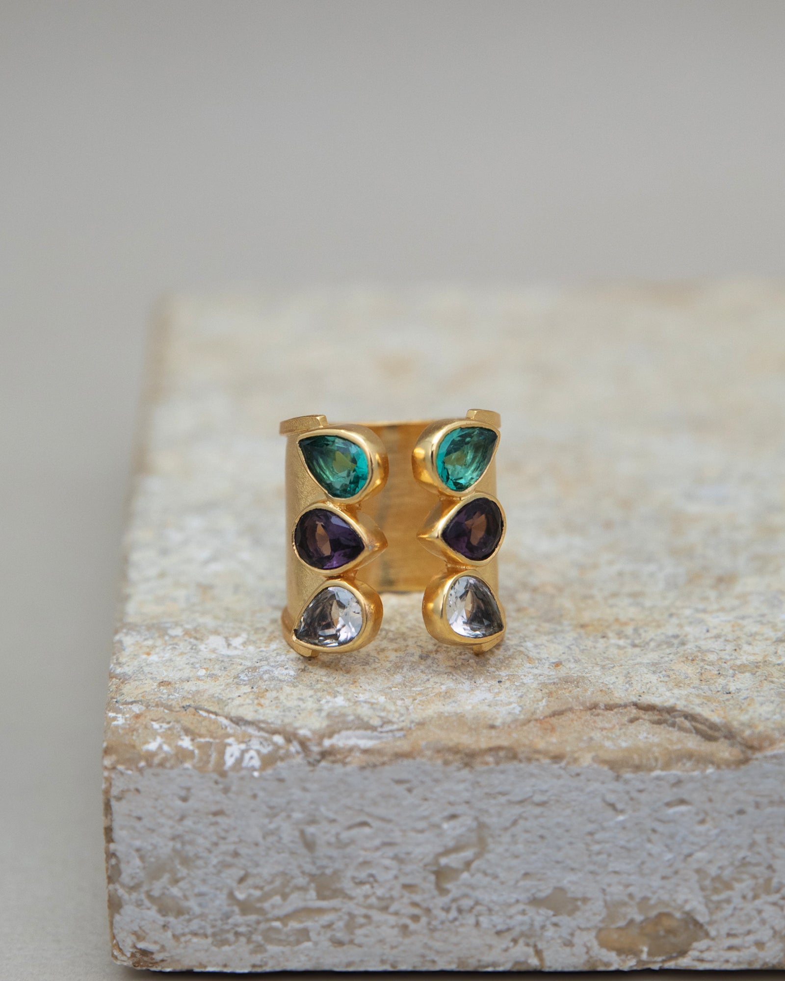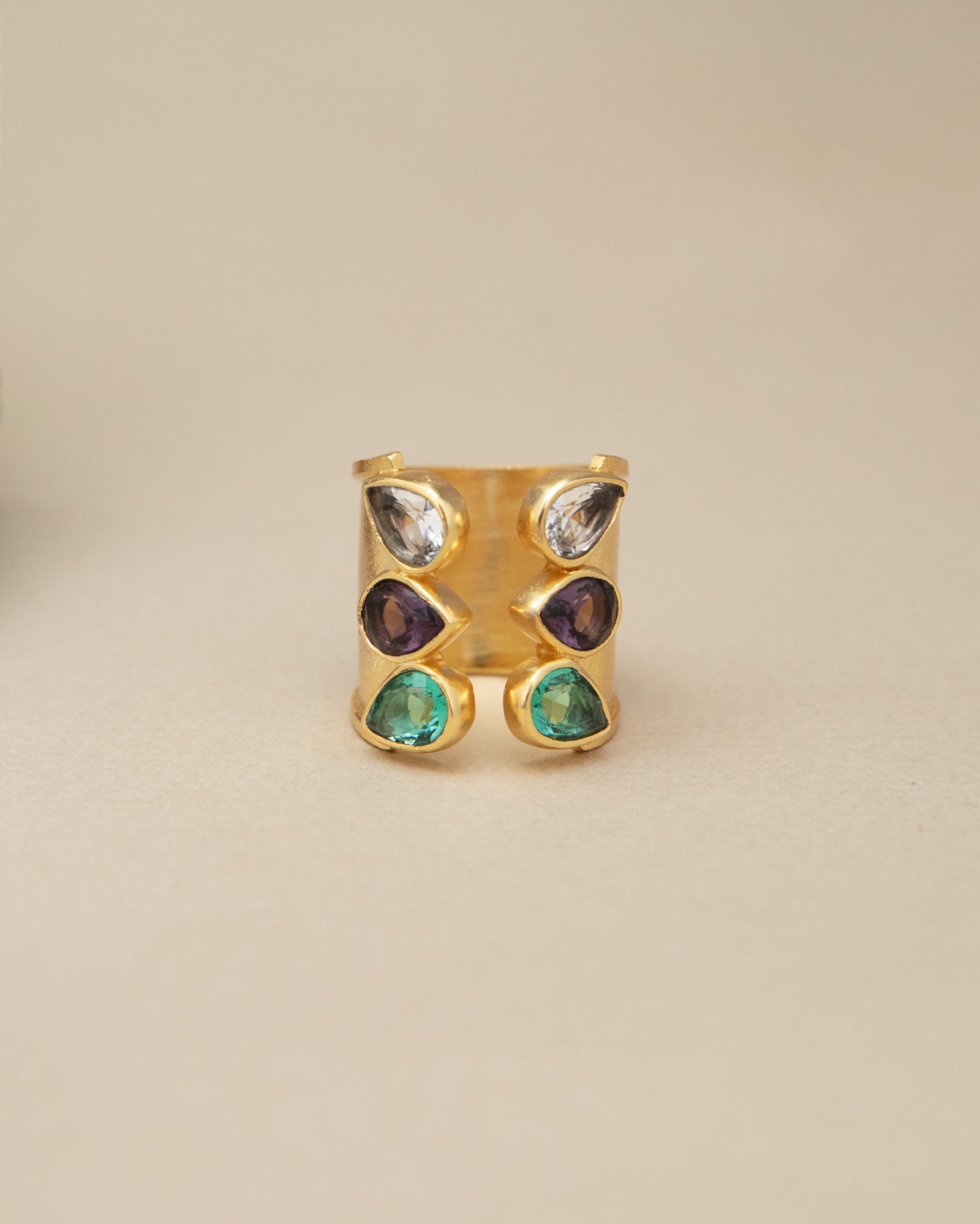 This unique trio bridge ring features three stunning gemstones.