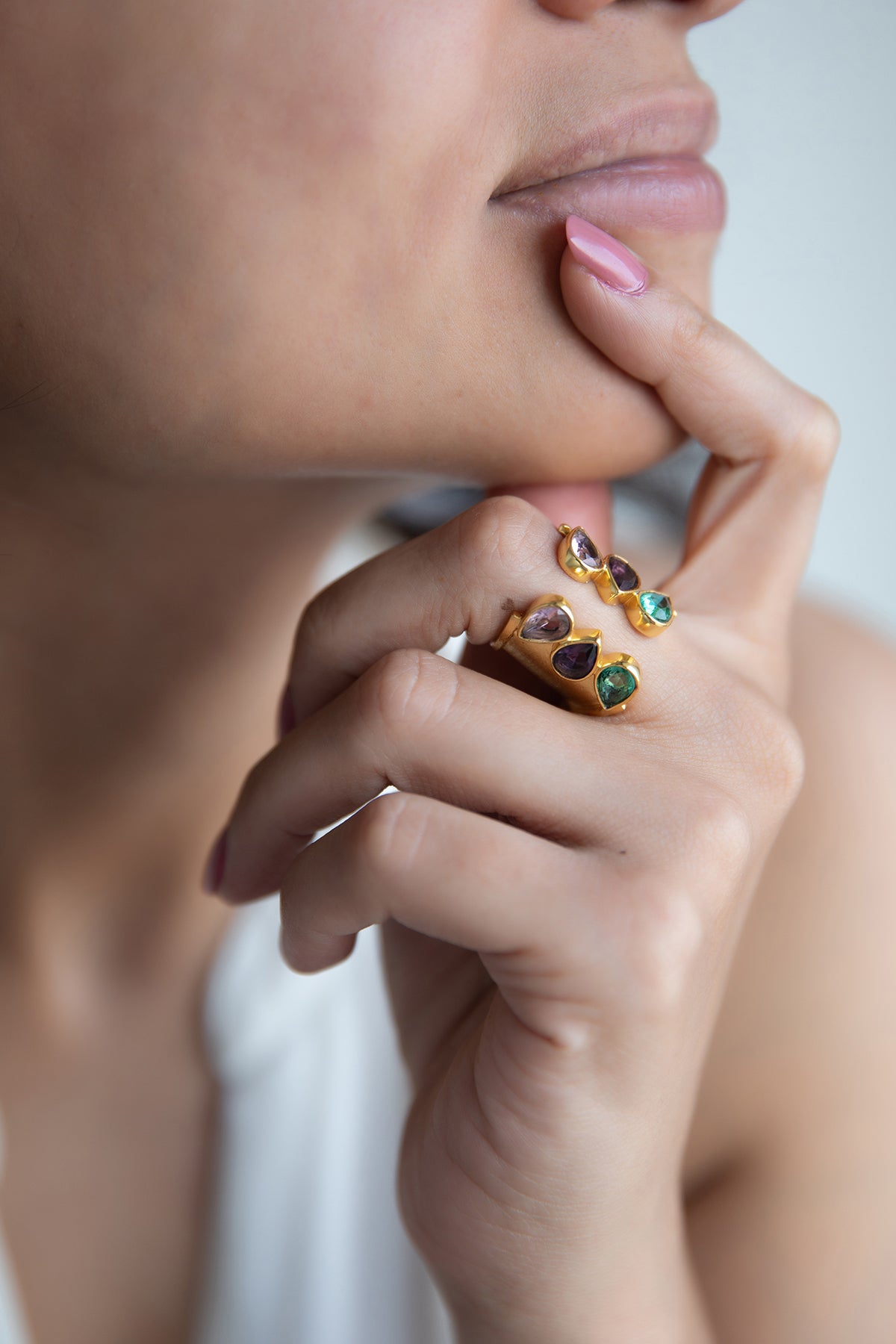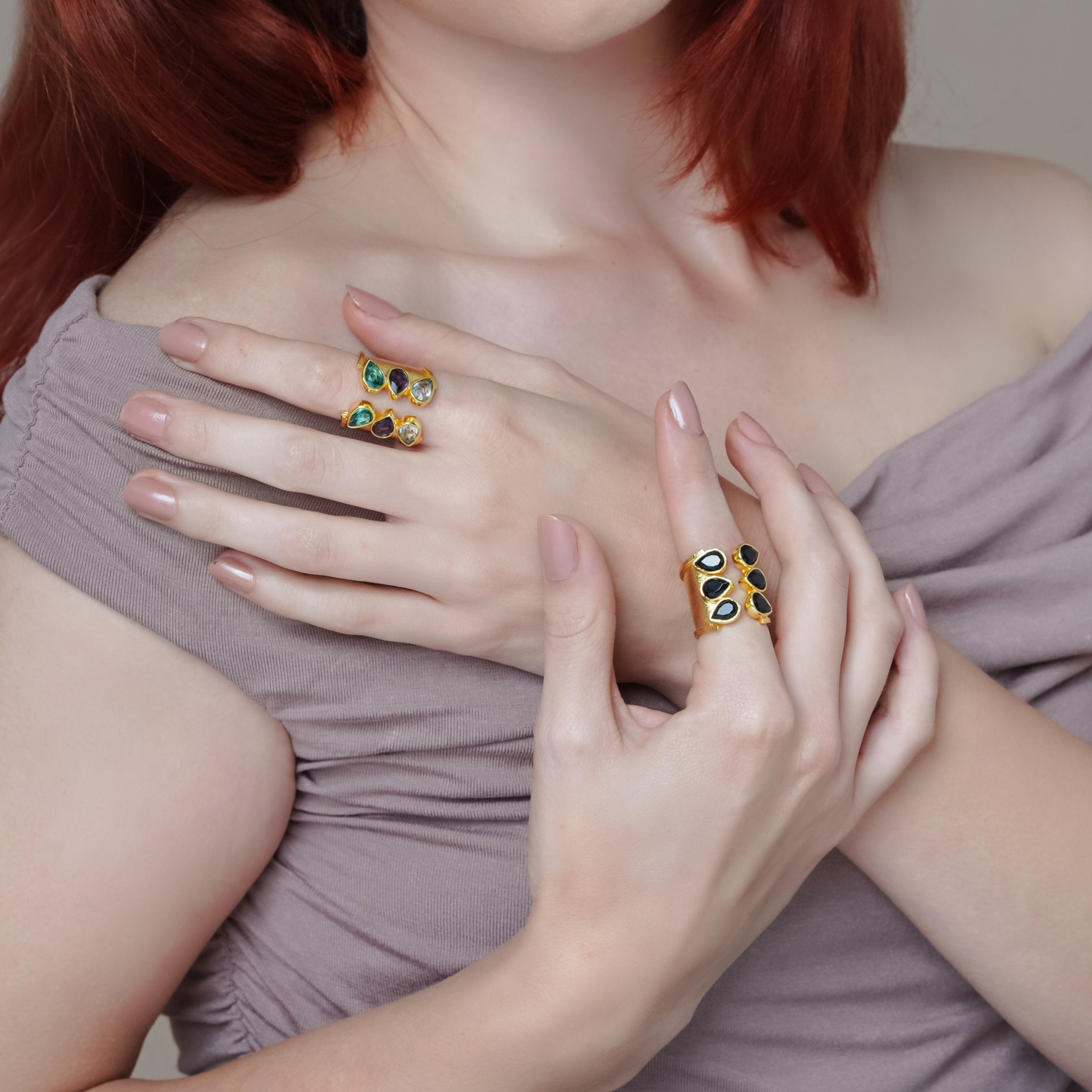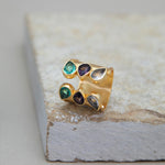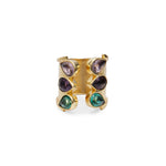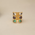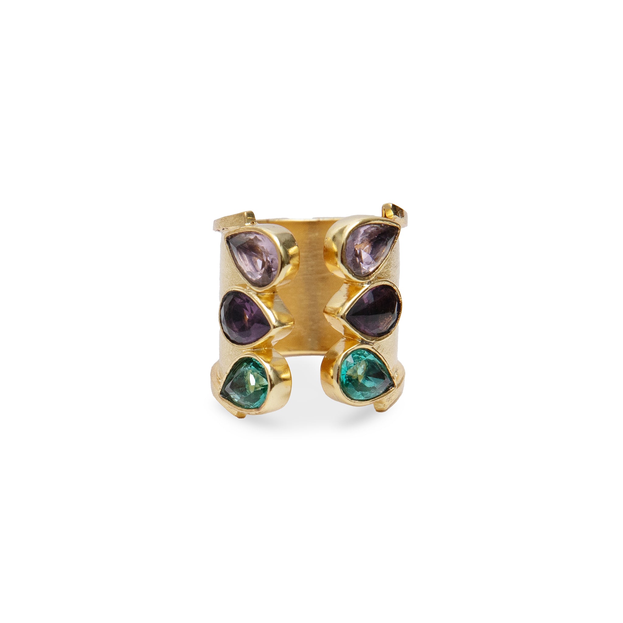 This unique trio bridge ring features three stunning gemstones.
