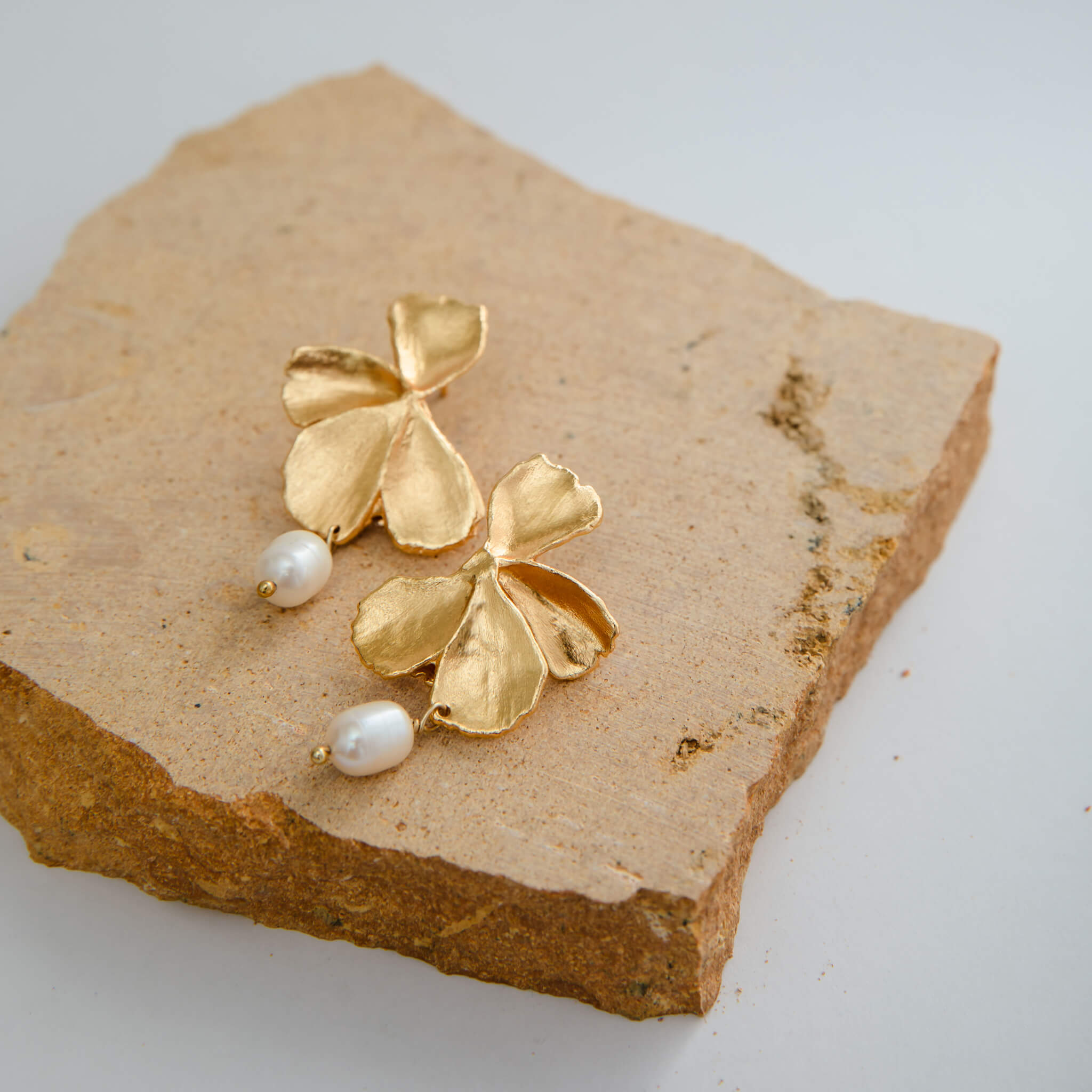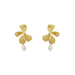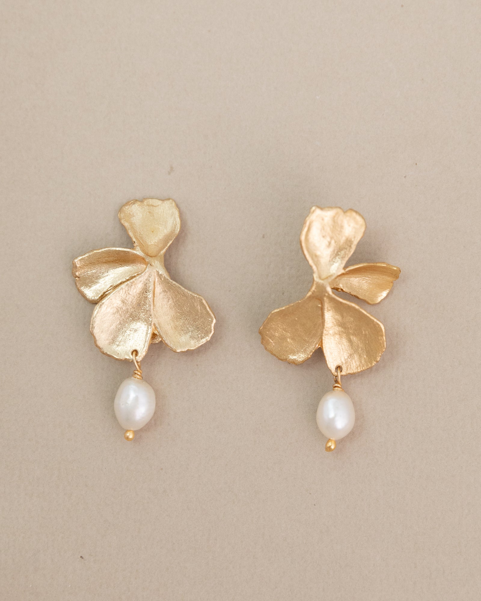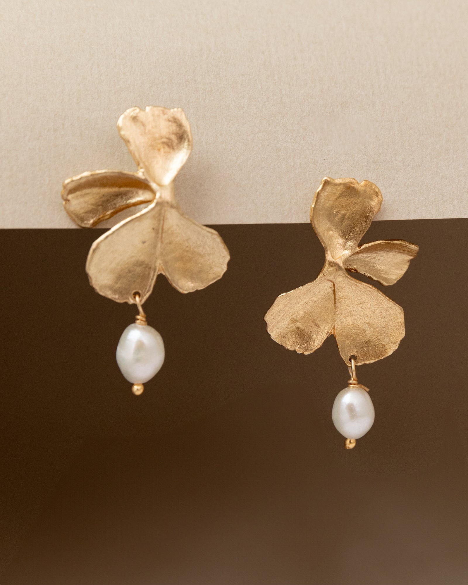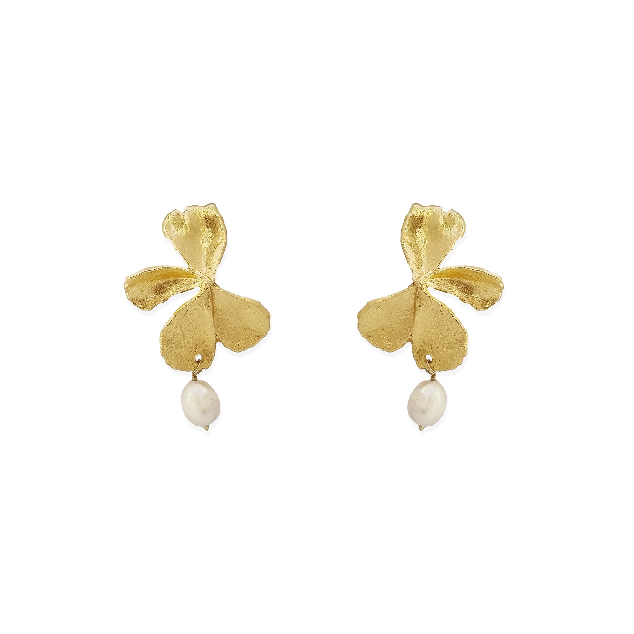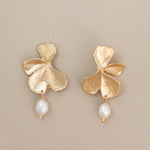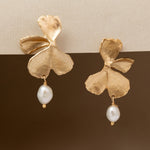 These earrings feature delicately sculpted orchid motifs in brass, providing an artistic and intricate backdrop for the lustrous pearls.