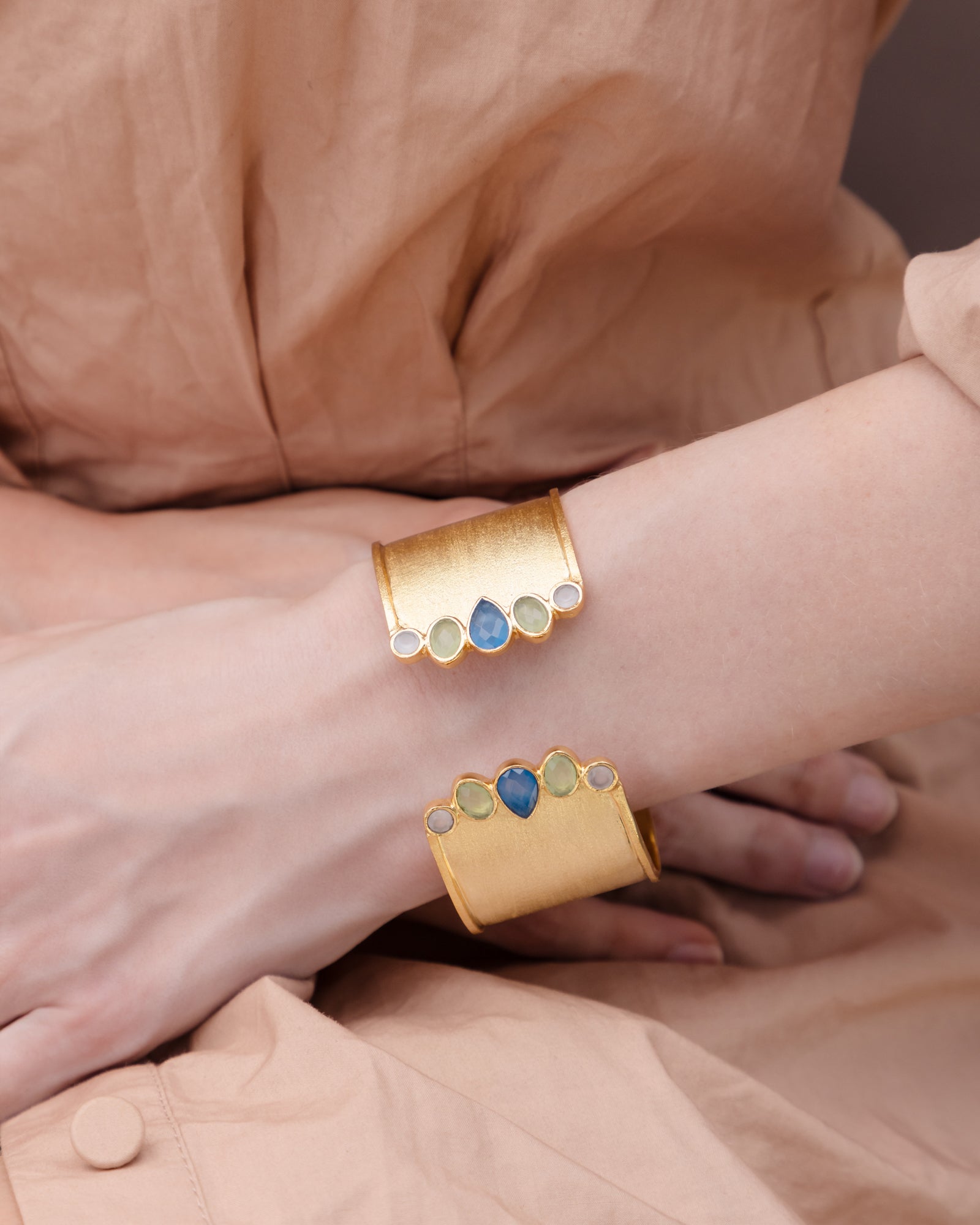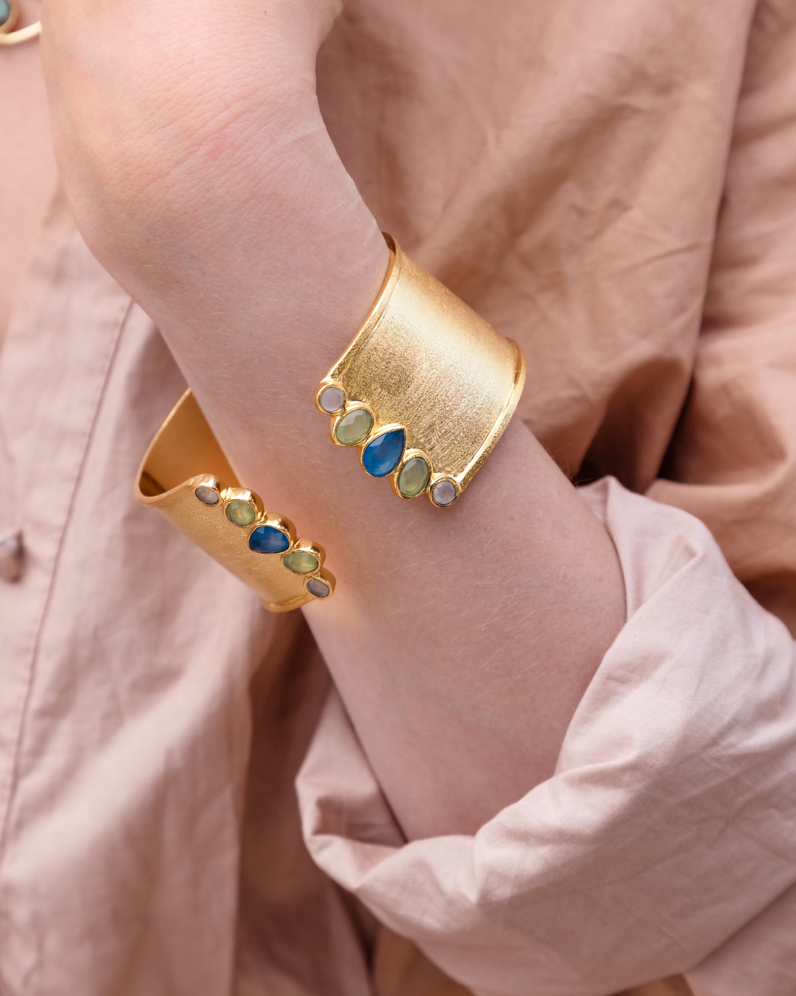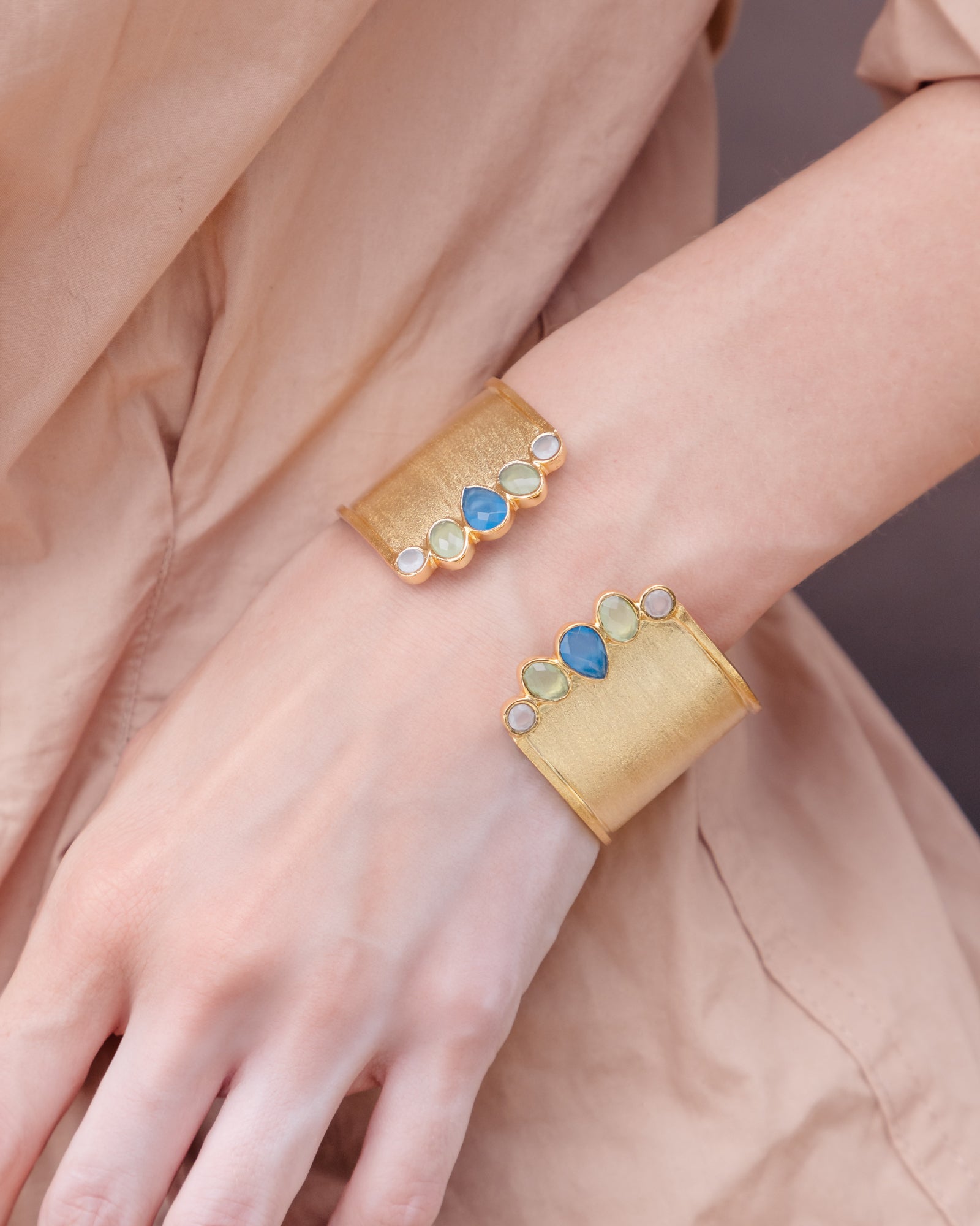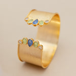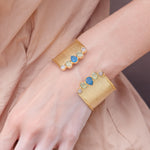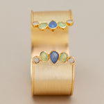 Our gemstone textured brass cuff is a captivating and vibrant bracelet that seamlessly blends the richness of various gemstones with the boldness of matte brass.