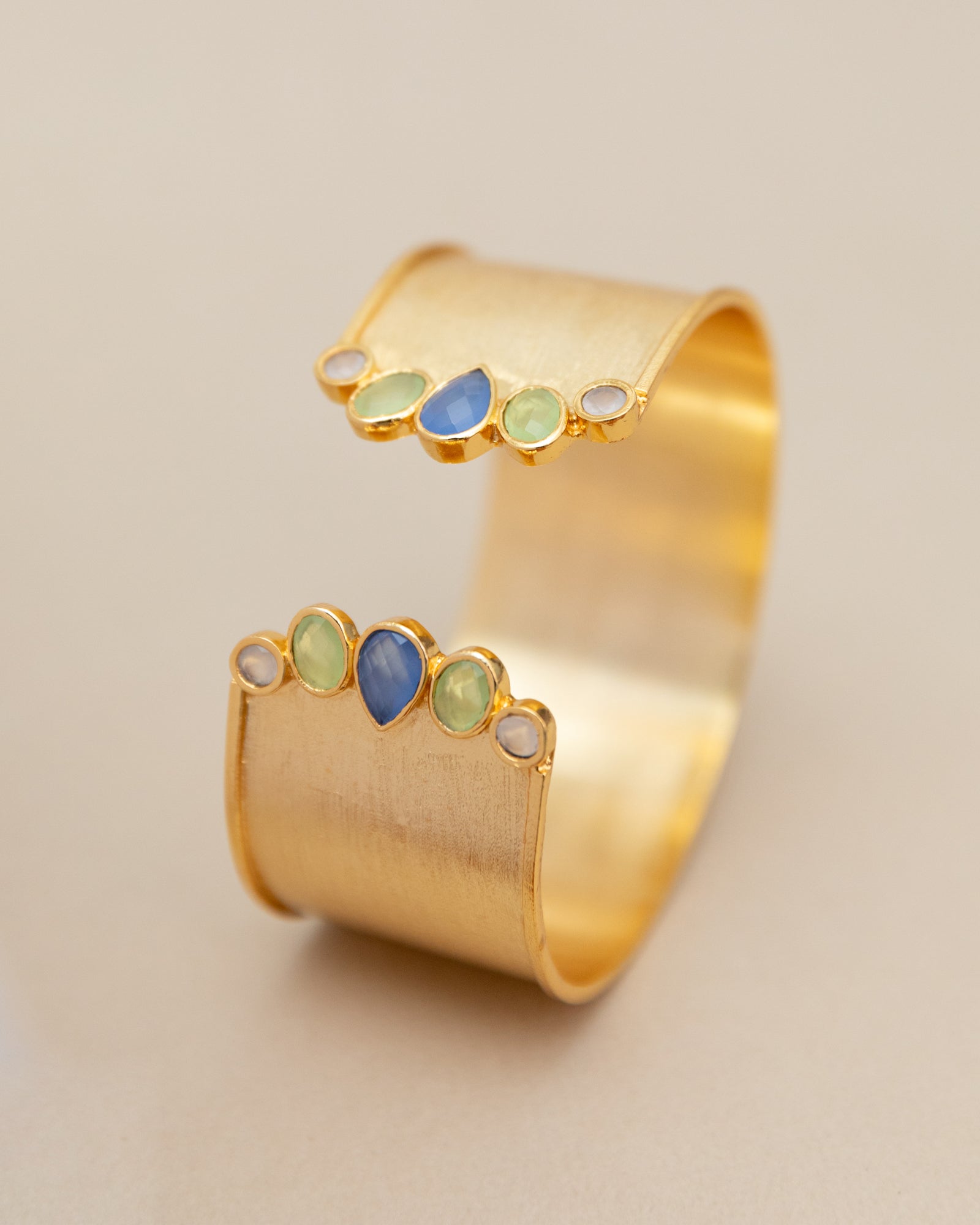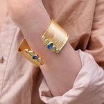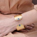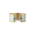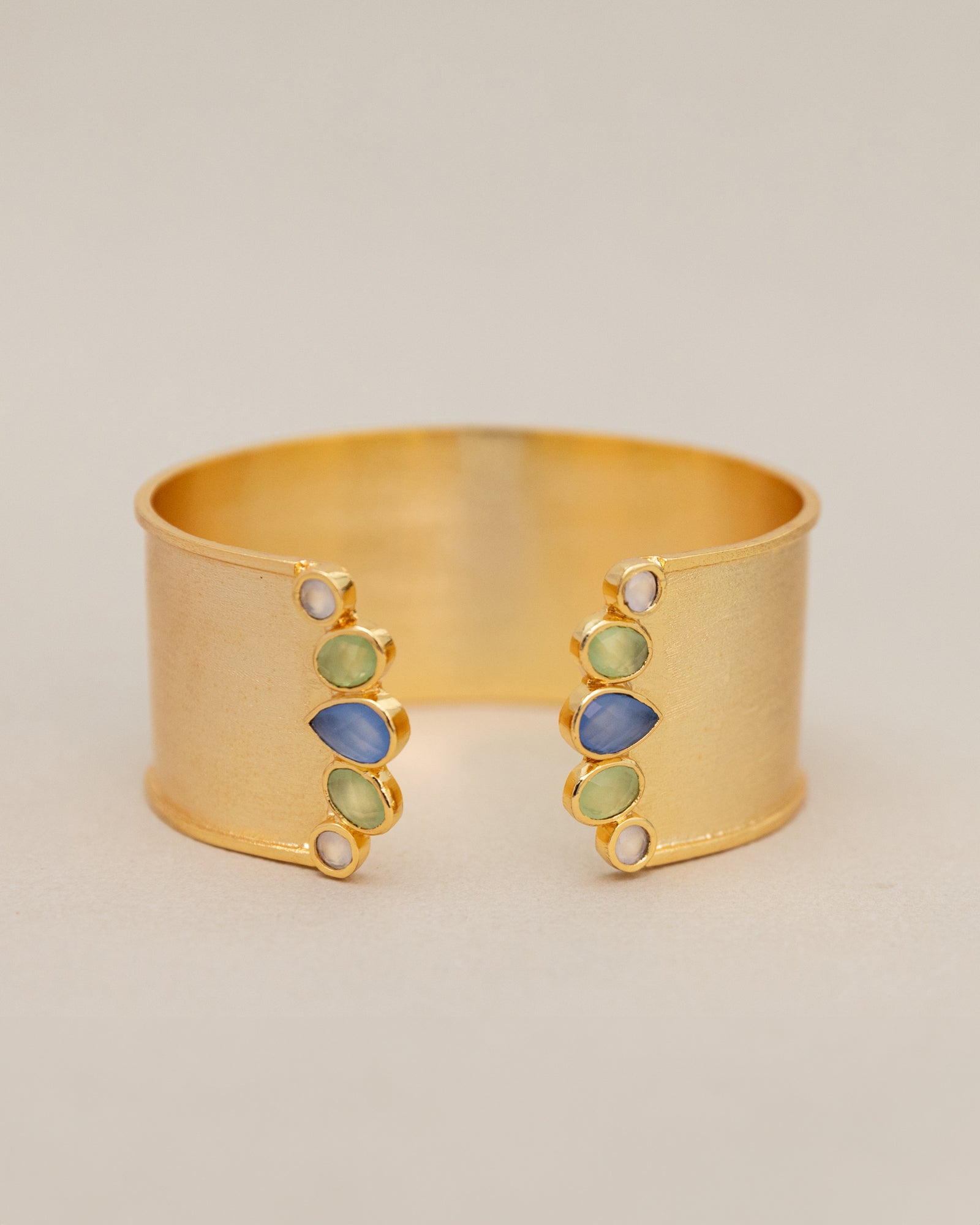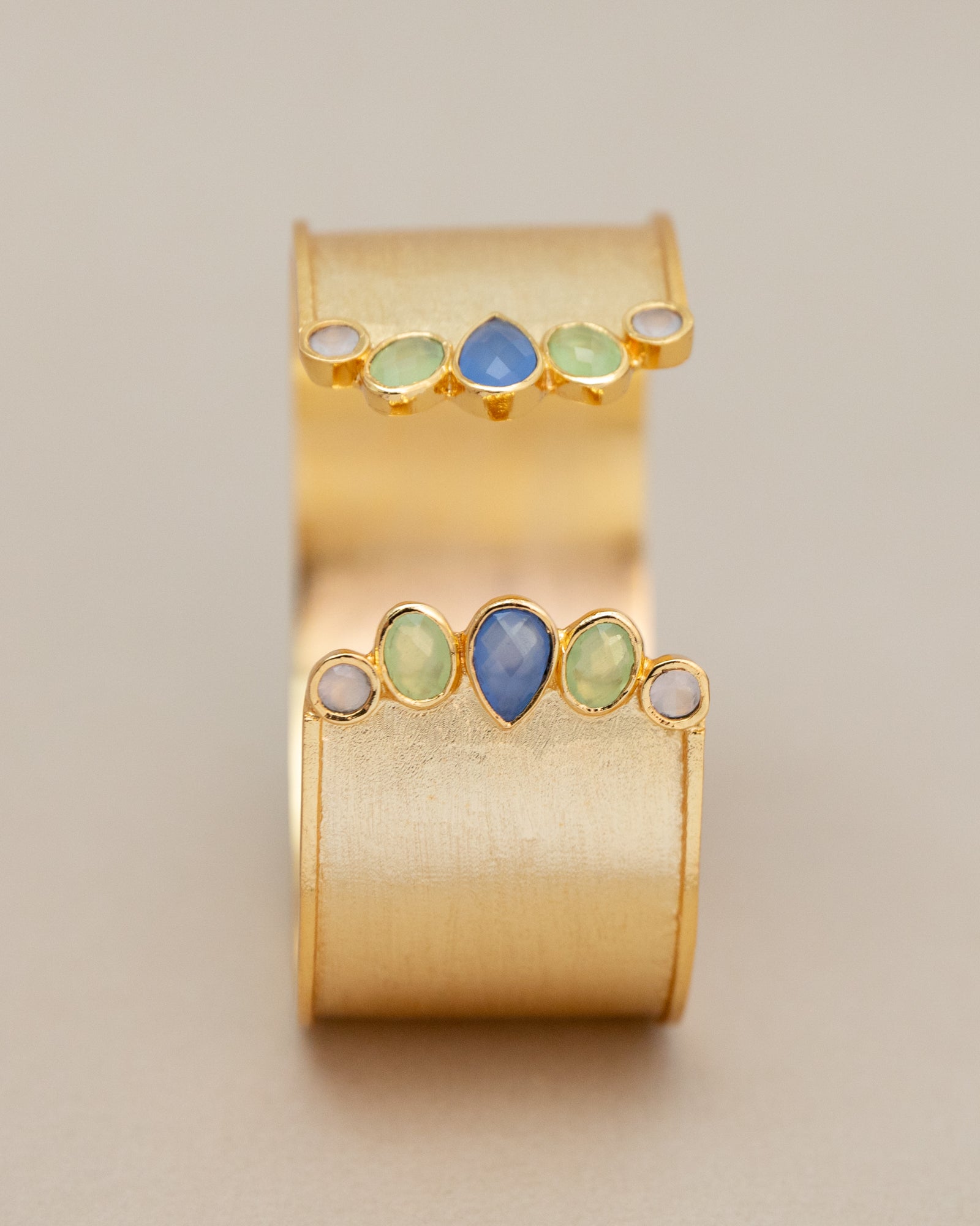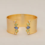 Our gemstone textured brass cuff is a captivating and vibrant bracelet that seamlessly blends the richness of various gemstones with the boldness of matte brass.