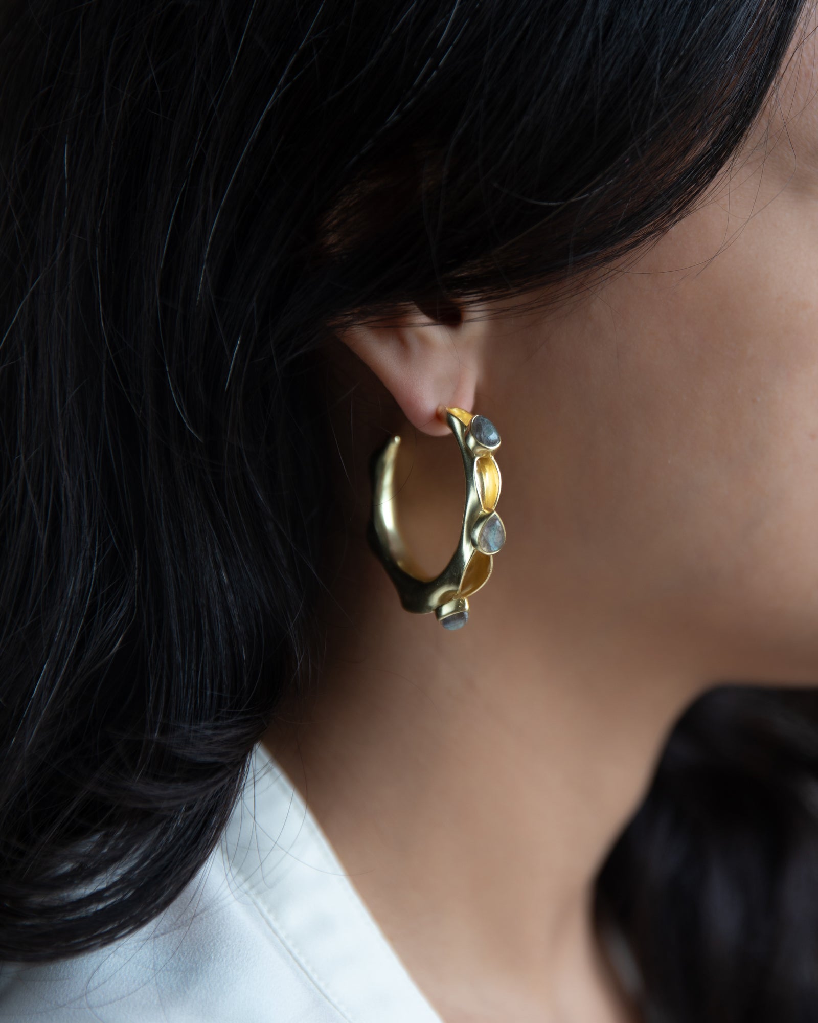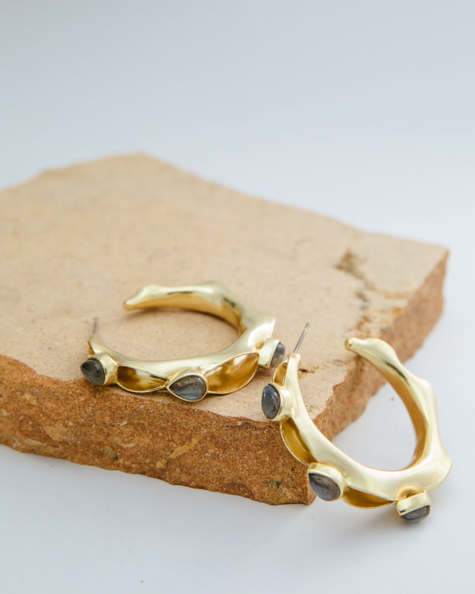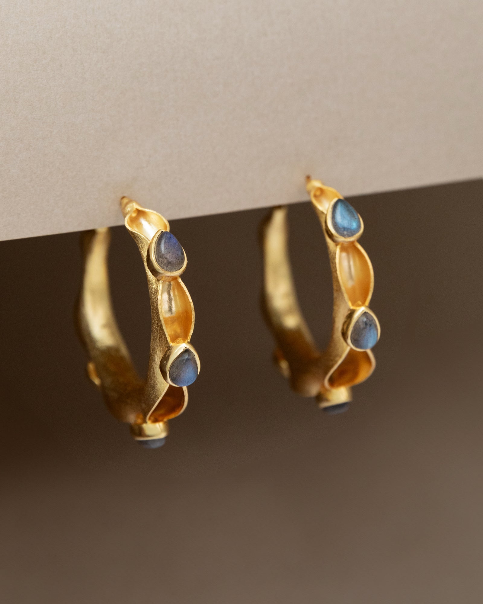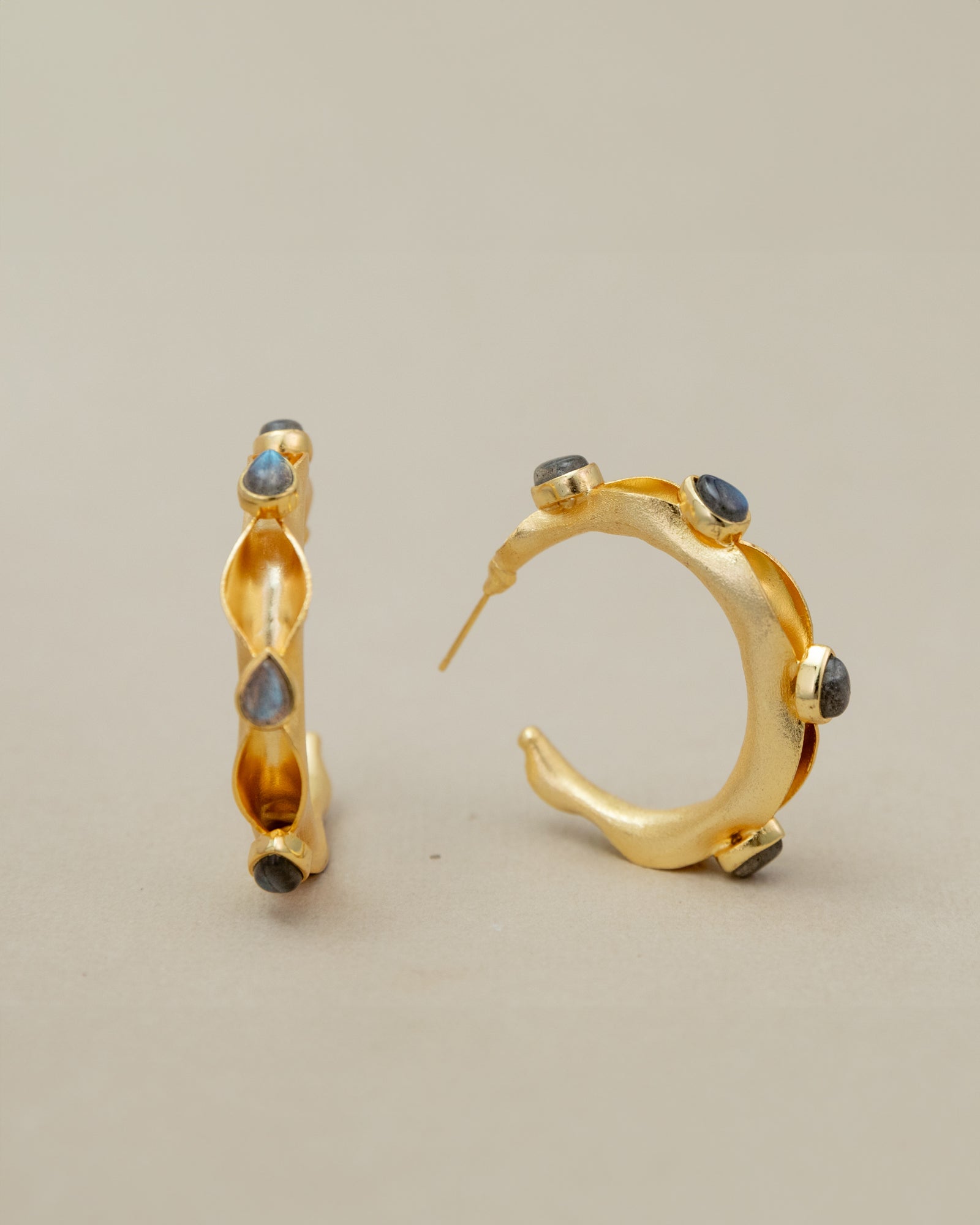 Our bloom earring in labradorites is an elevated hoop – handcrafted to resemble the delicate petals of a blooming flower.