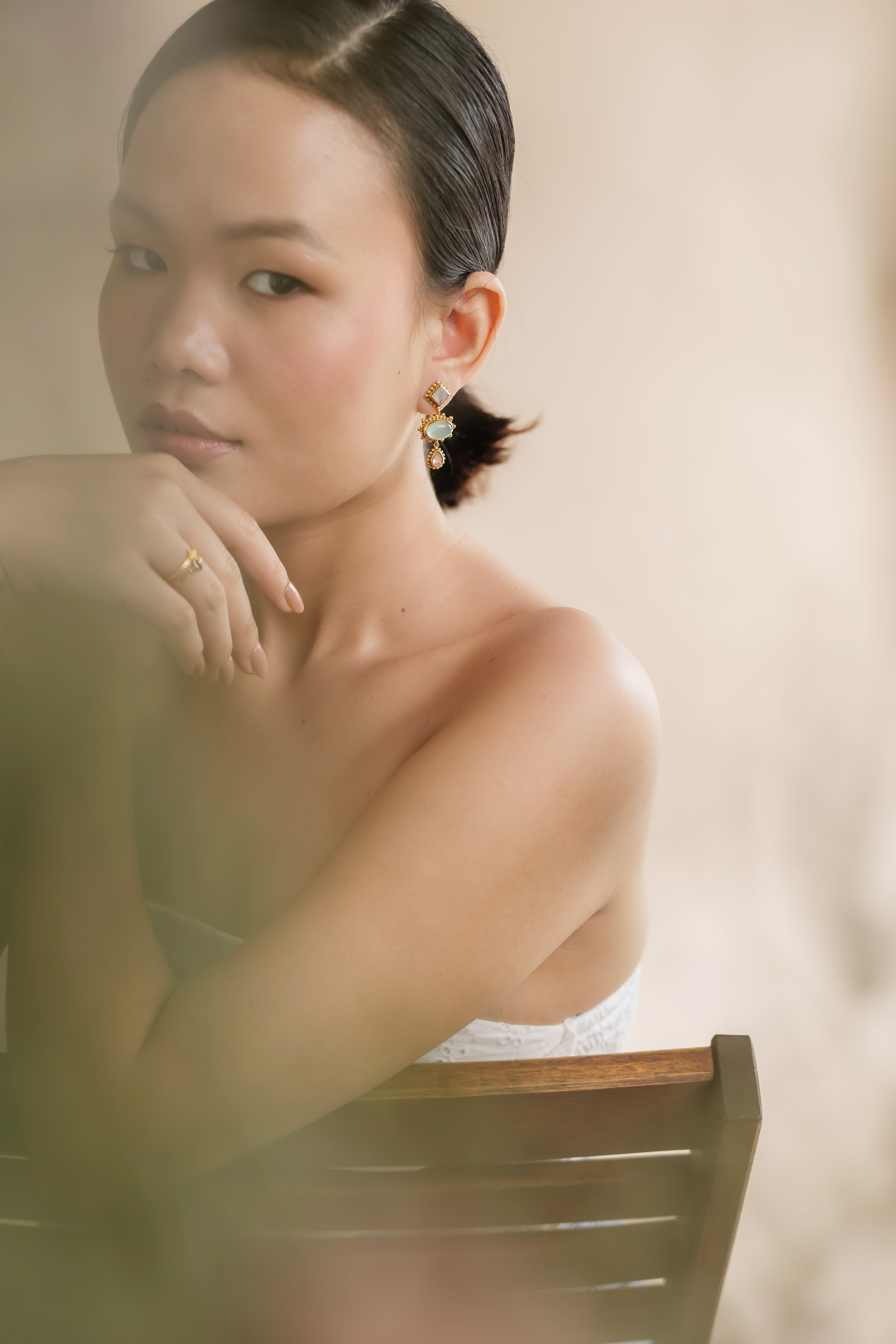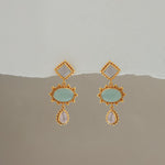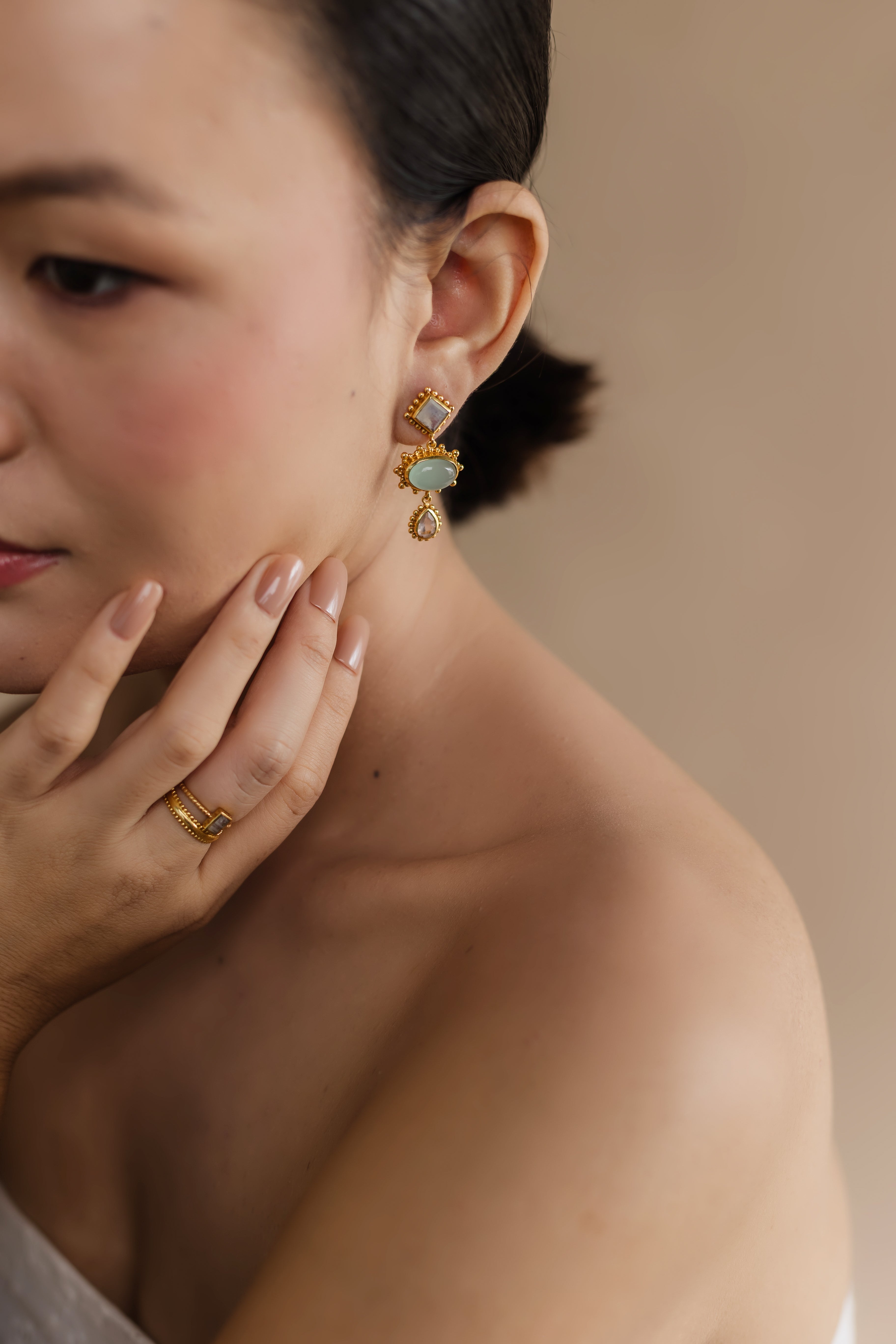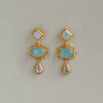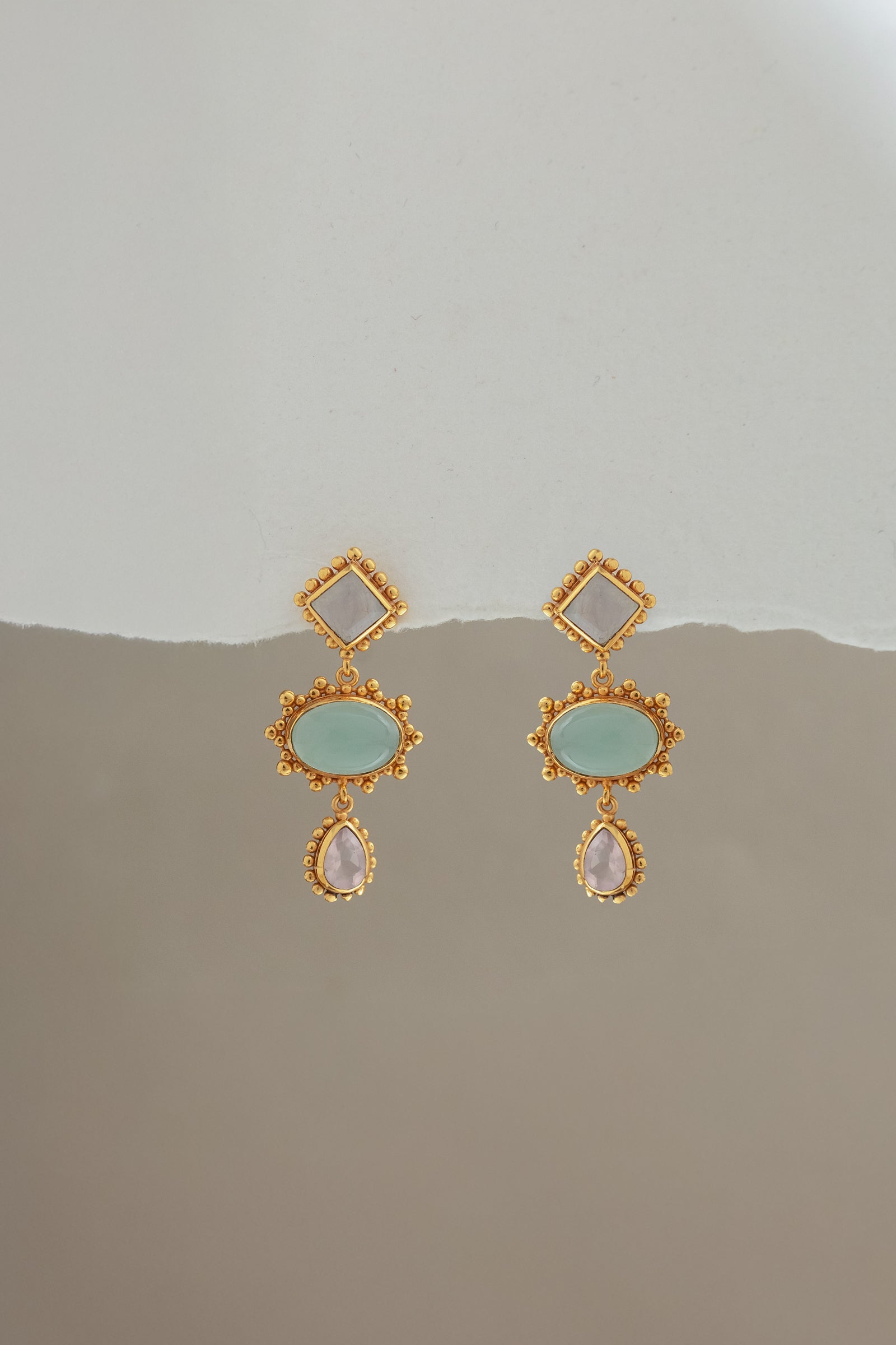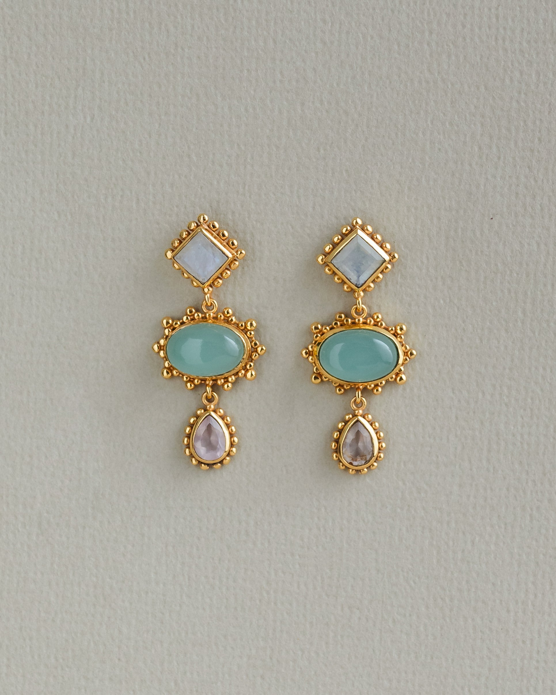 Handcrafted with a pastel palette of moonstone, aqua, and rose quartz. Intricate beading and granulation details give these earrings unique artisanal charm.