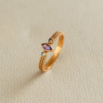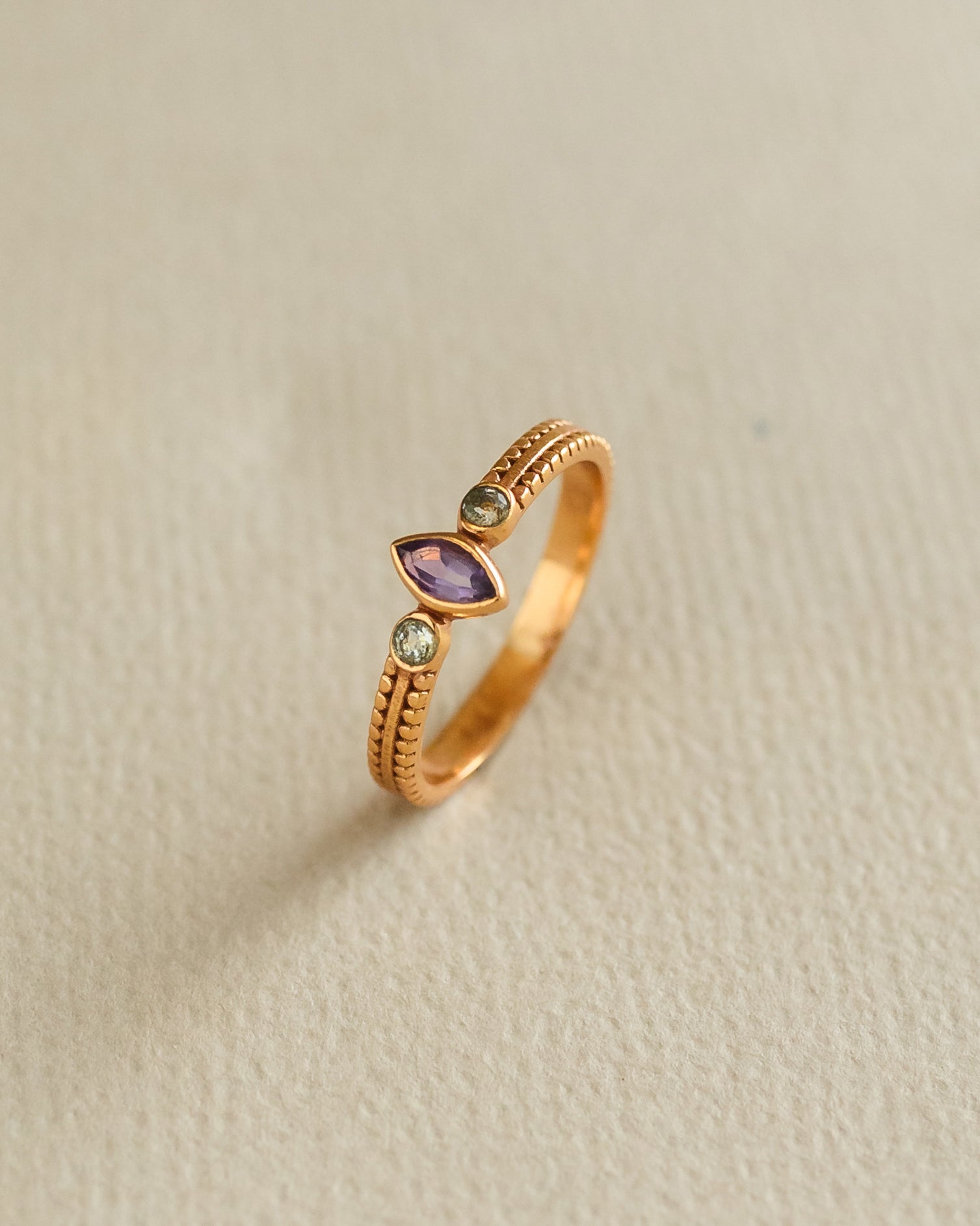 A delicate beaded band with a faceted amethyst center stone – minimal yet luminous.