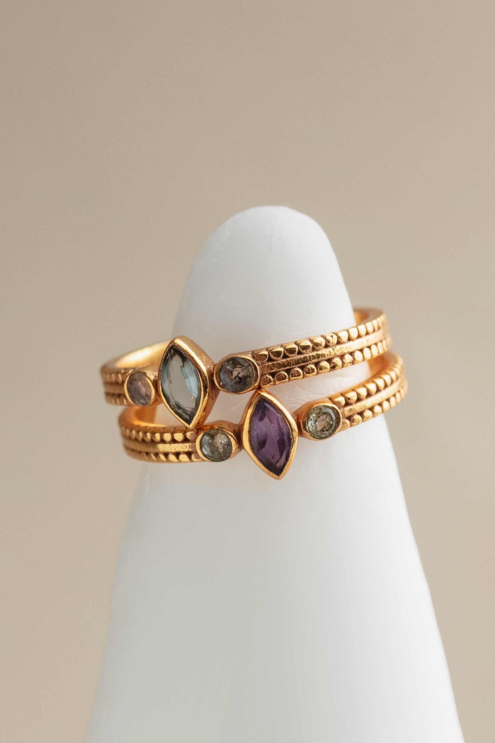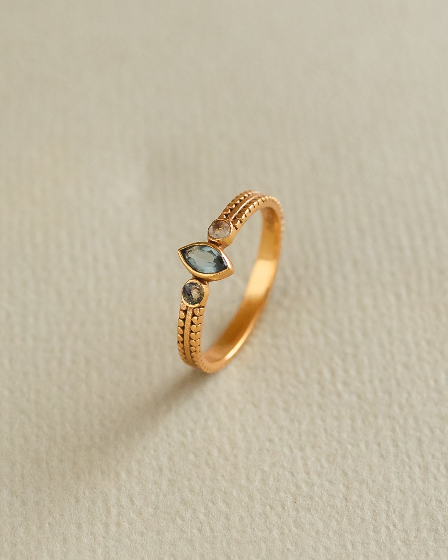 A shimmering aqua stone set on a beaded base with smoky topaz accents – fresh, minimal, and beautiful.