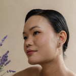 Lightweight column earrings featuring blue chalcedony and moonstone, interspersed with beaten brass plates. Artisanal glamour in a modern silhouette.