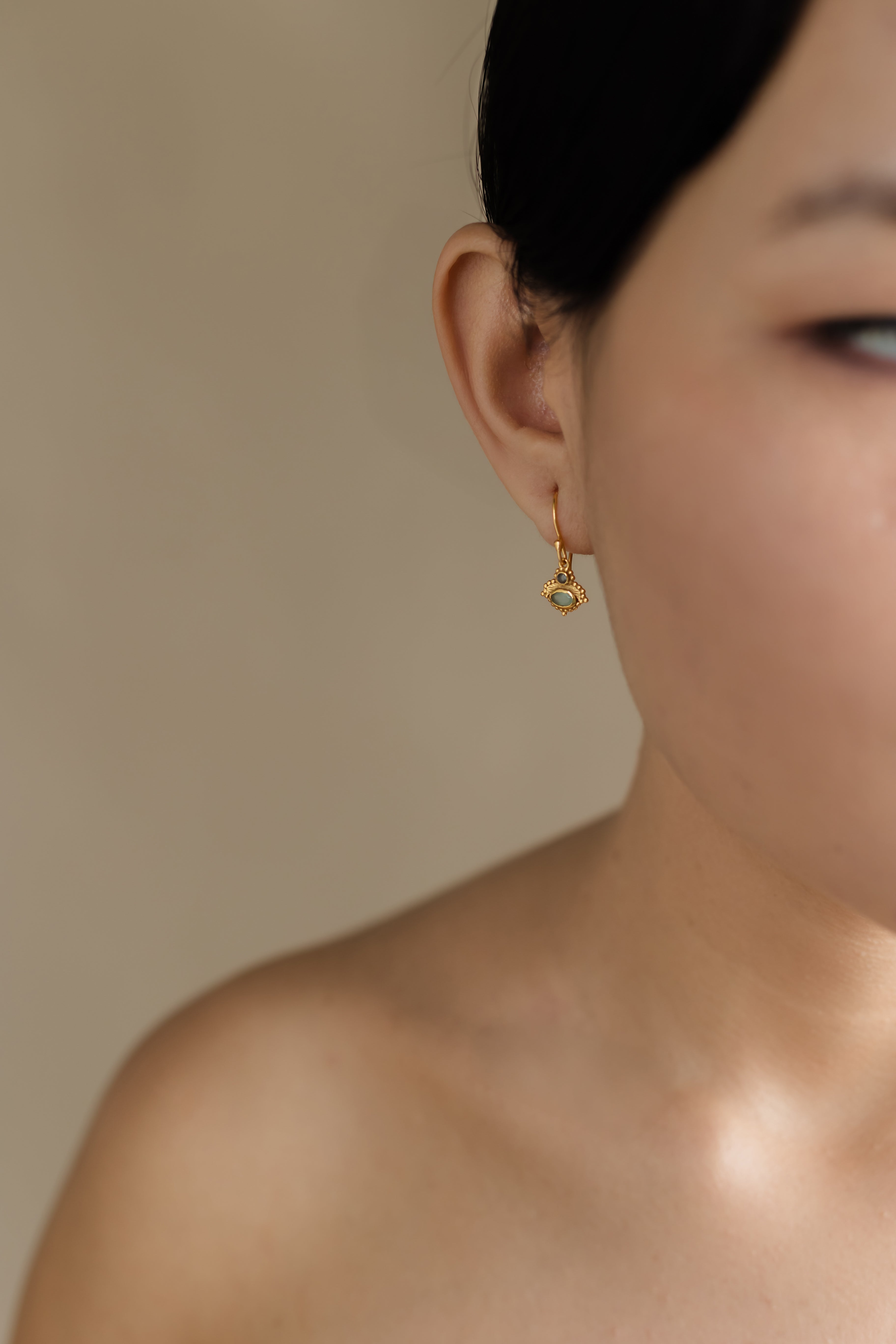 A minimal interpretation of the evil eye. With delicate beading and luminous labradorite paired with aqua, these earrings bring understated elegance to any look.