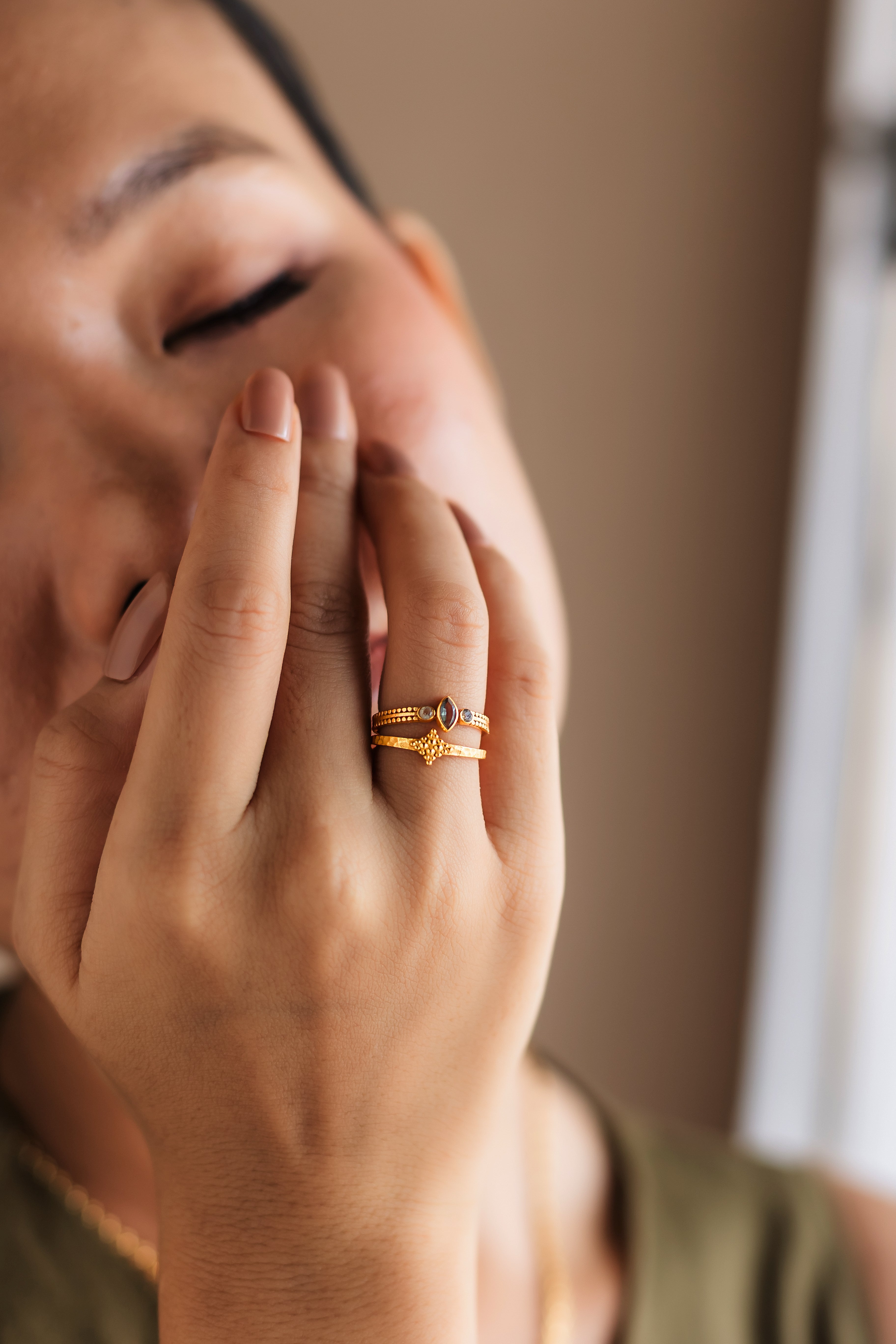 A beautifully handcrafted, beaten brass ring with a beaded motif – minimal, eye-catching, with an interplay of texture.