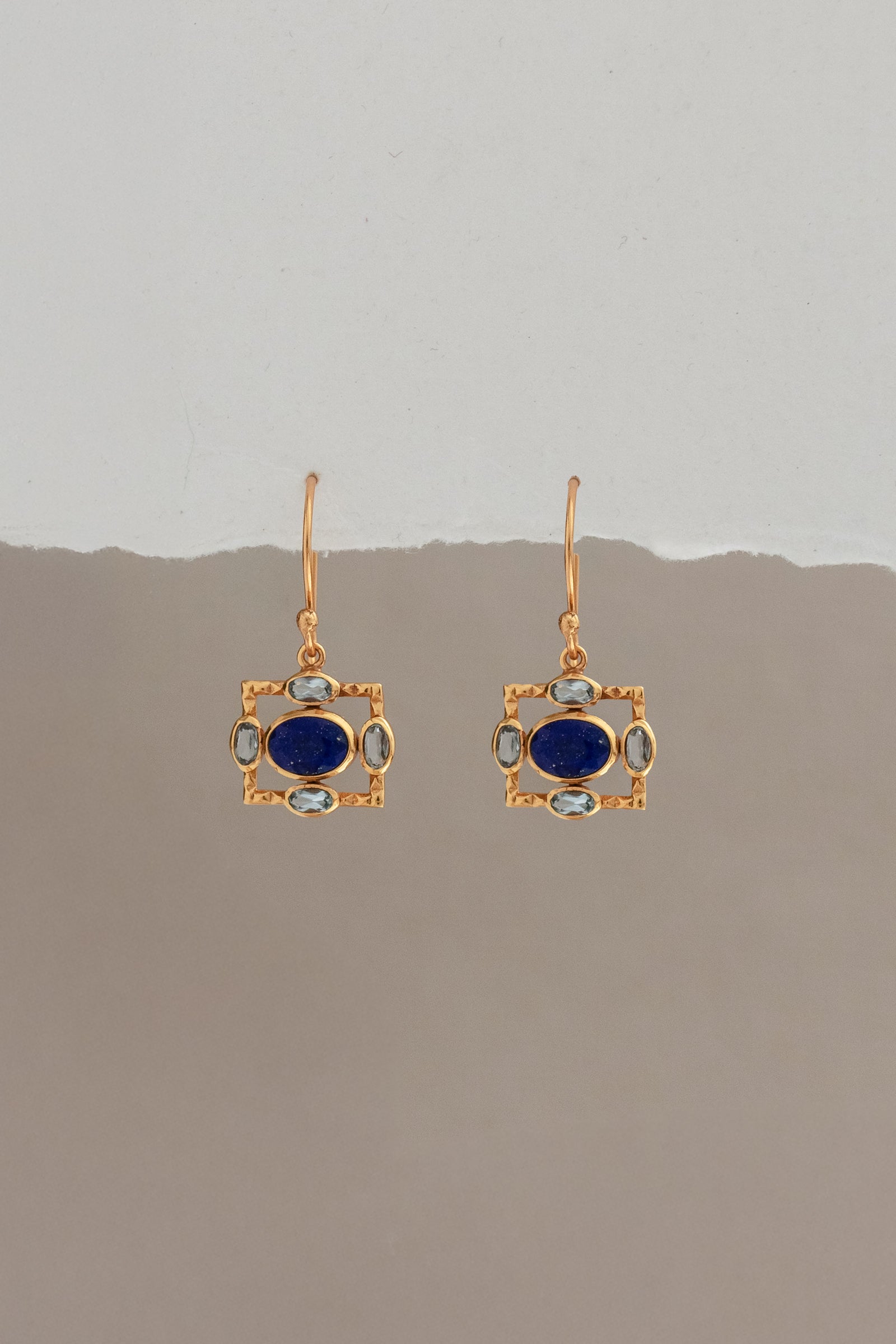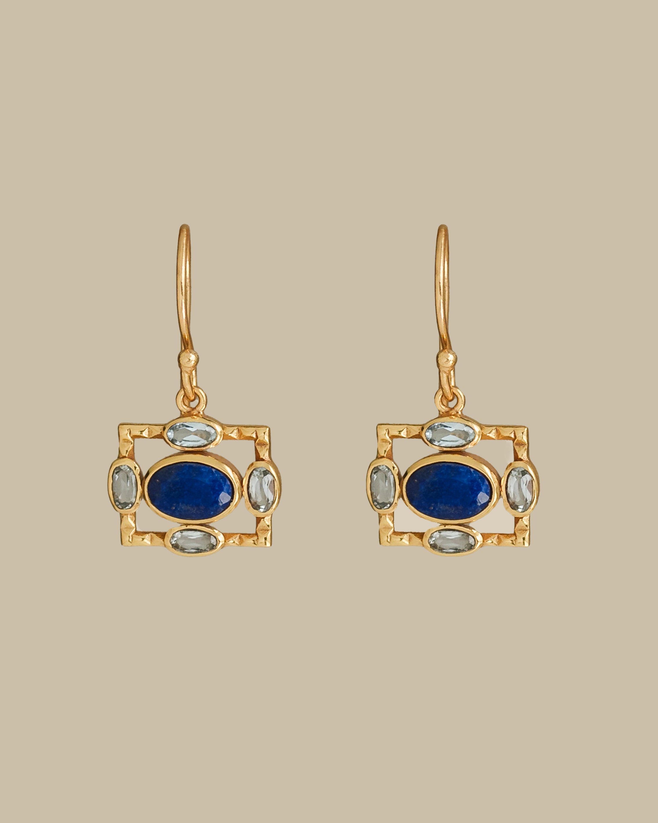 Inspired by ancient jewels of the Ottoman Empire, this drop design mixes textured brass details with the timeless combination of lapis and blue topaz. Dreamy, old-world charm reimagined.