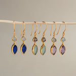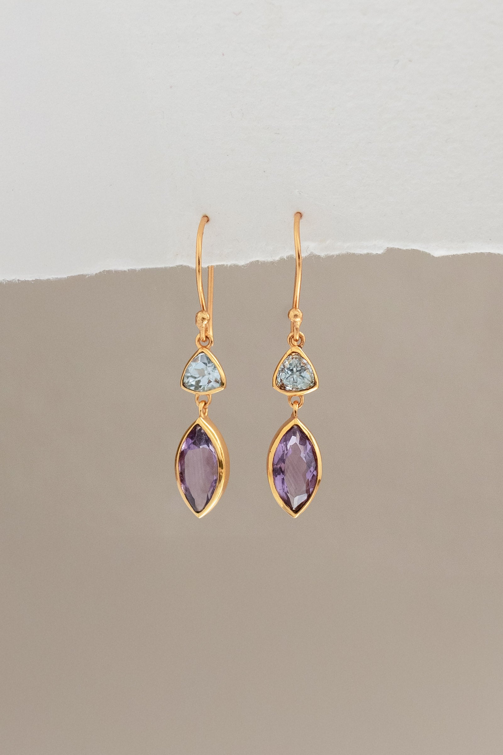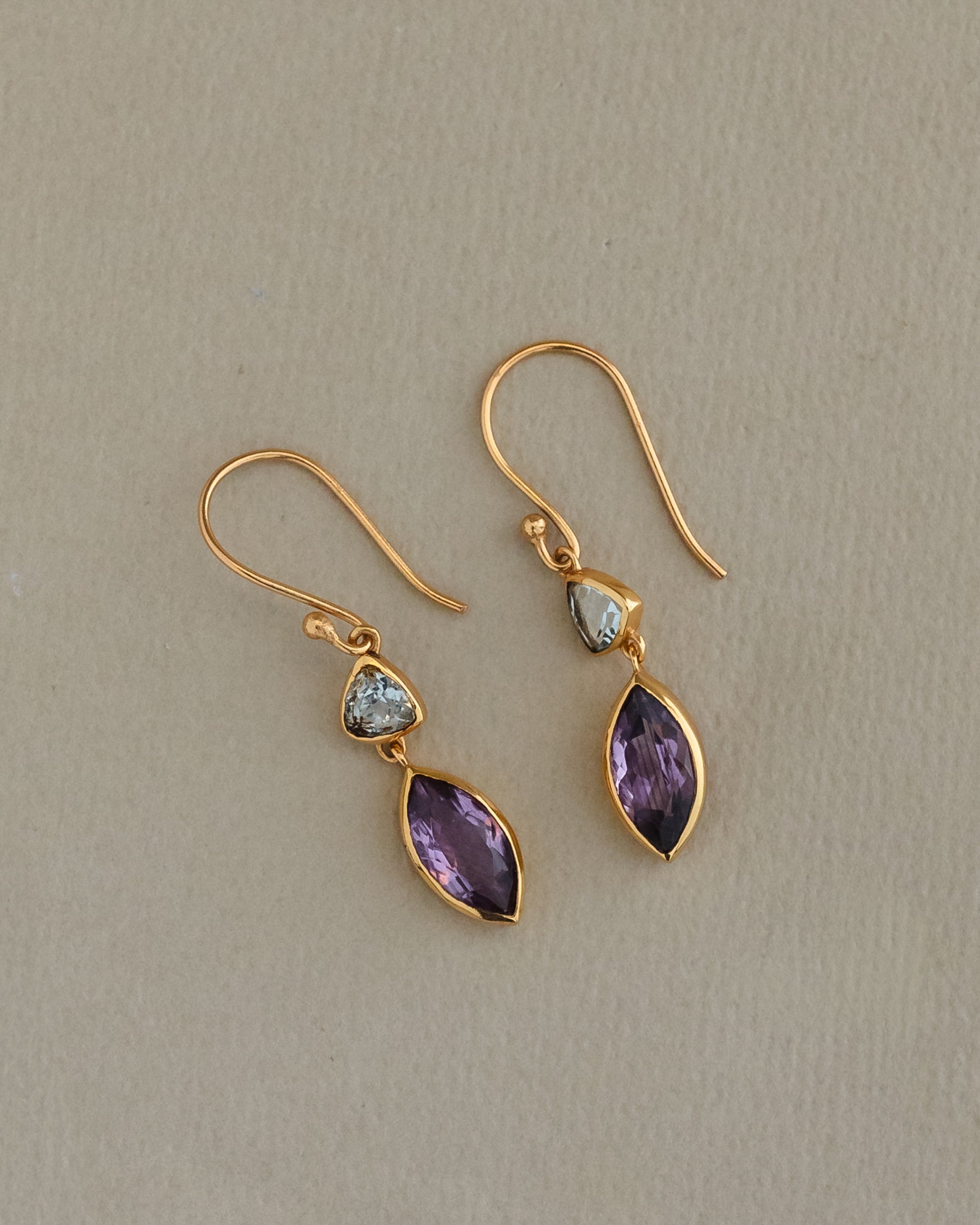 A striking marquise-cut blue topaz drop framed by a delicate amethyst stud – a harmonious ode to perfect geometry. The most tunning bezel for everyday glam.