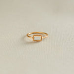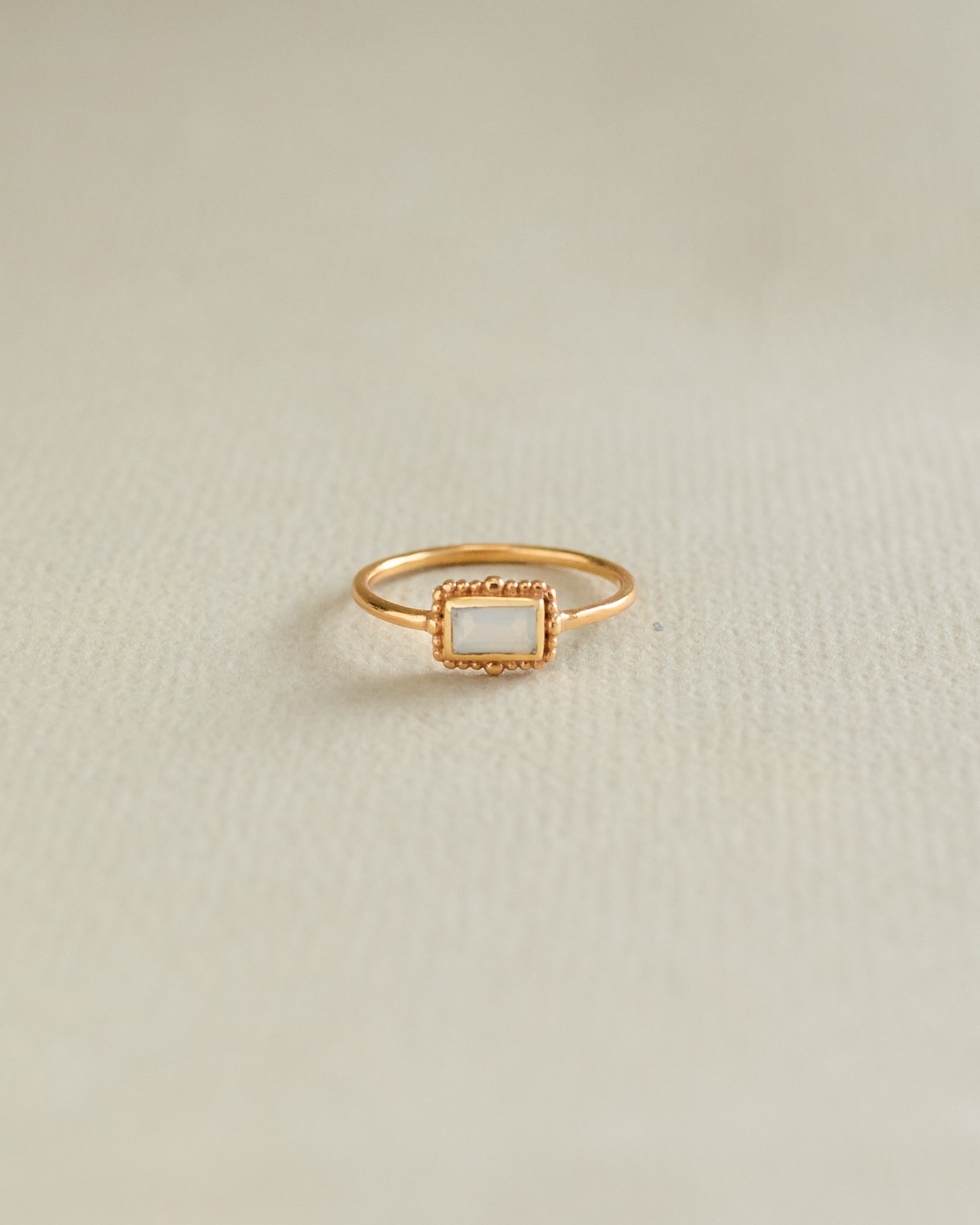 A minimal east-west set moonstone stone in a textured, beaded bezel. Fresh, modern, and endlessly wearable.