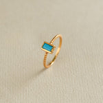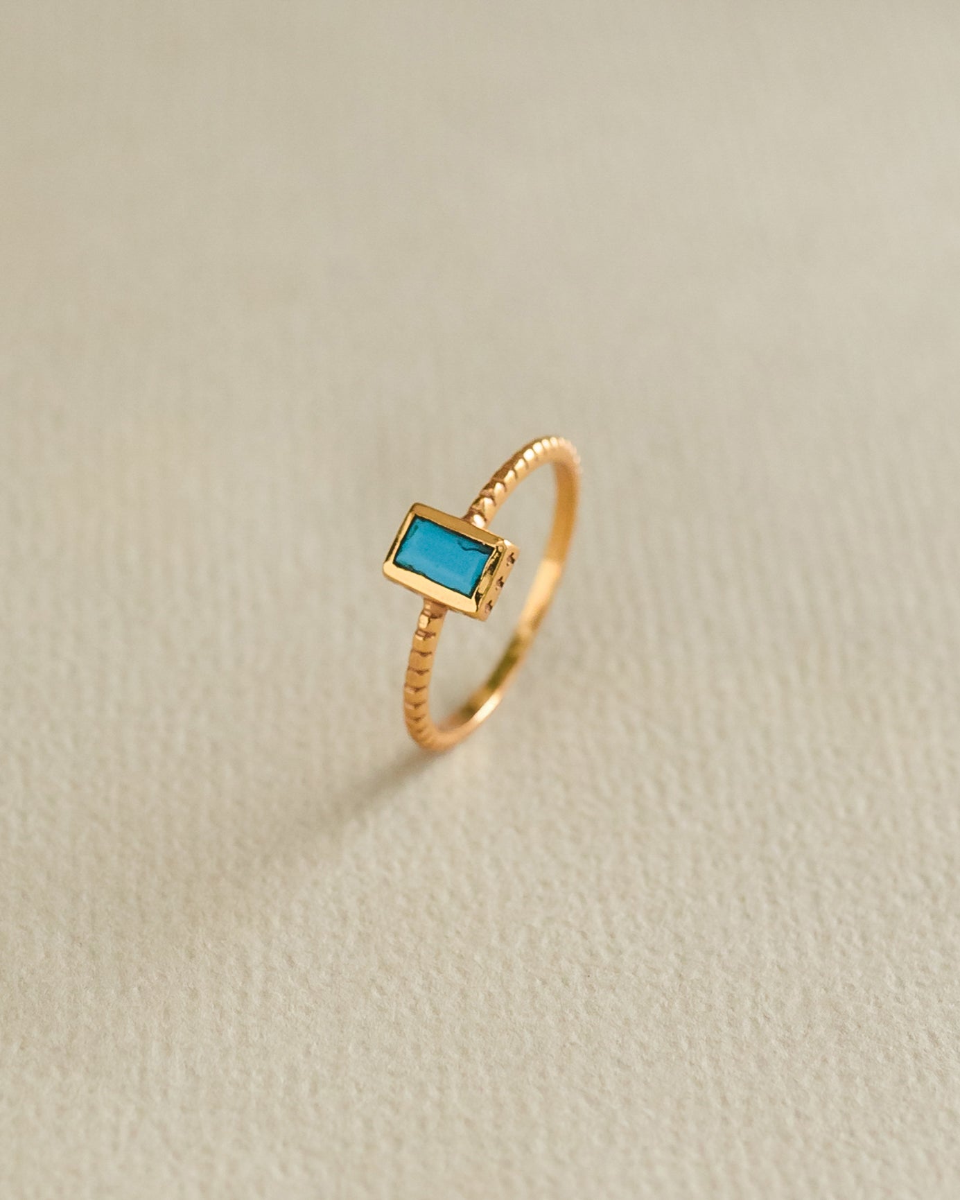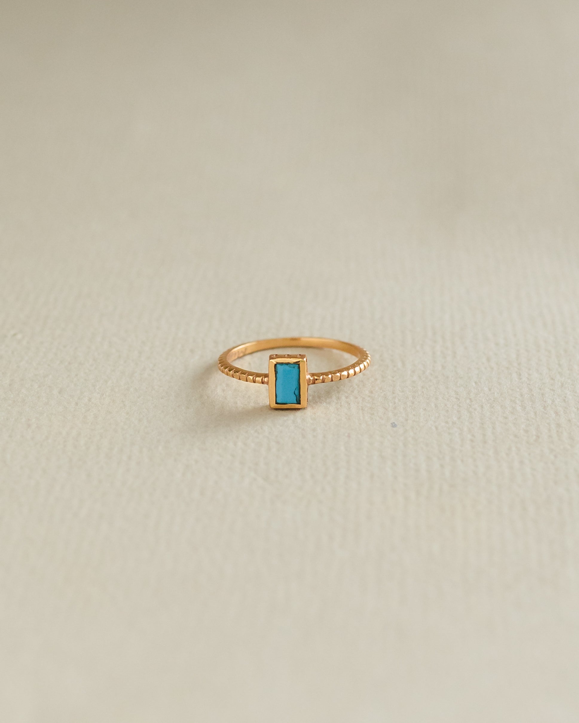 A textured bezel enhances the natural beauty of a vibrant turquoise center stone.