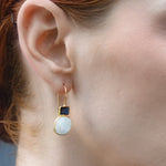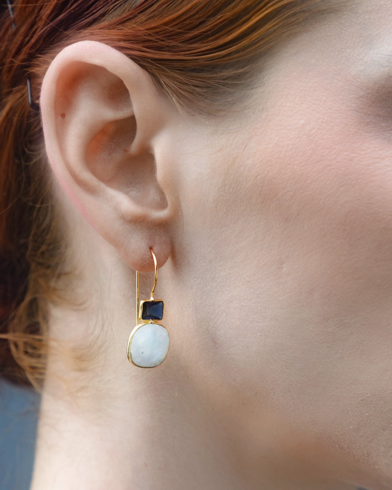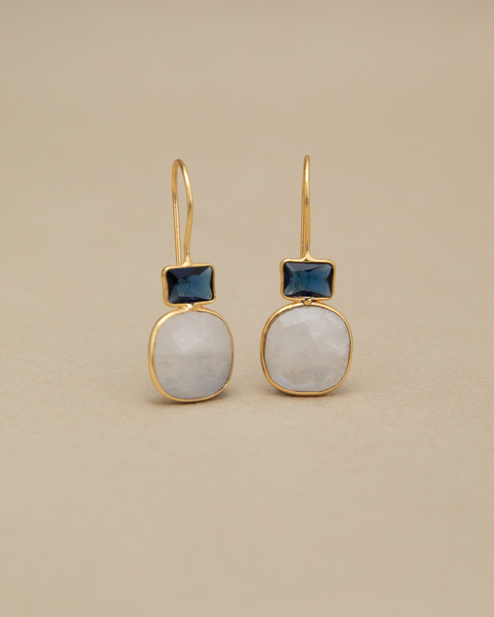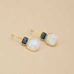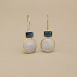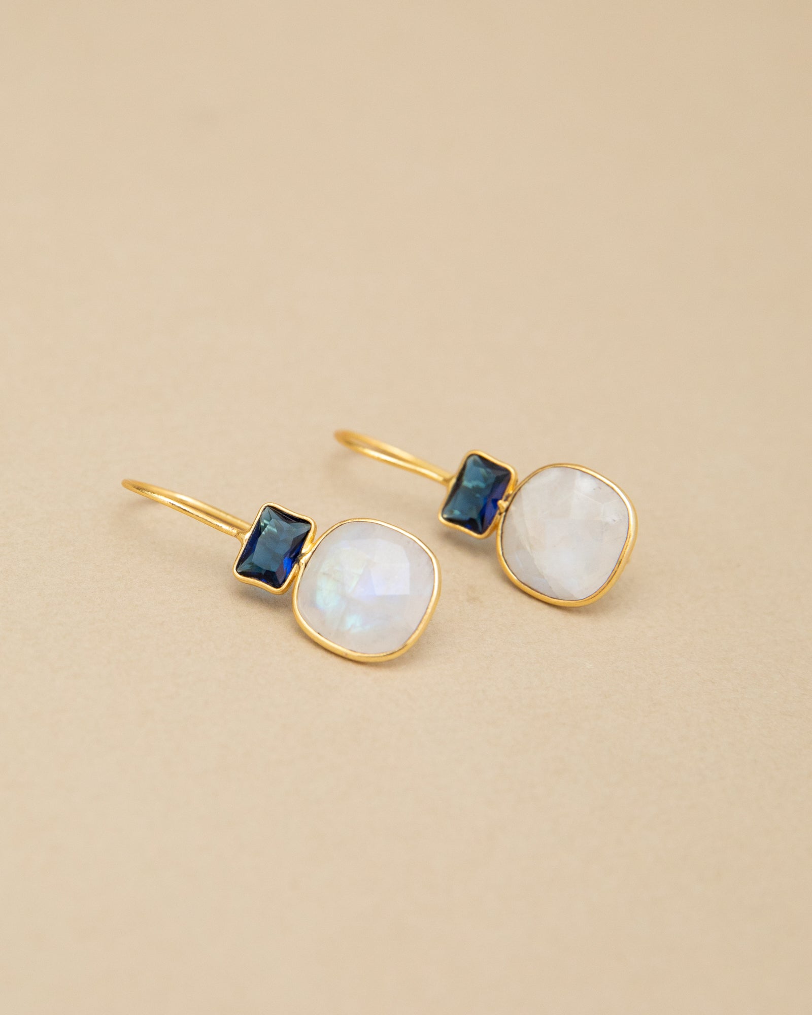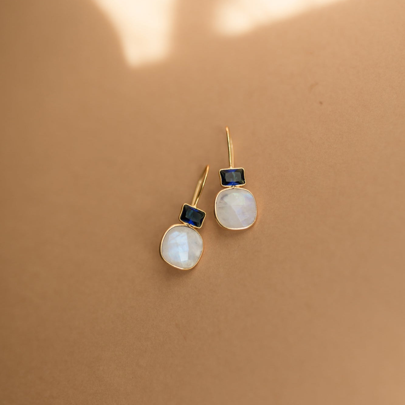 Introducing our Sapphire and Moonstone Drop Earrings a captivating blend of deep blue hues and the ethereal glow of moonstones.