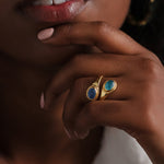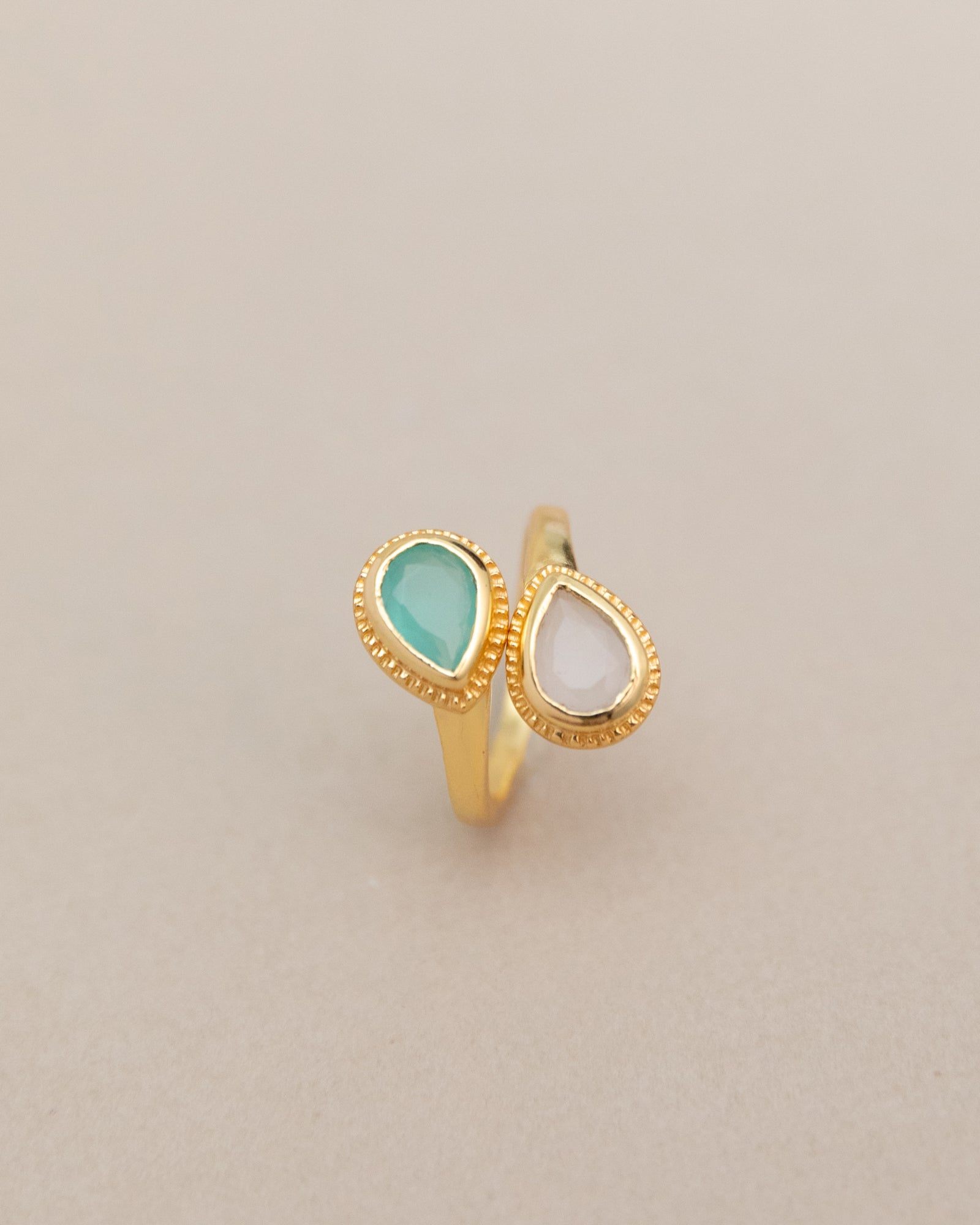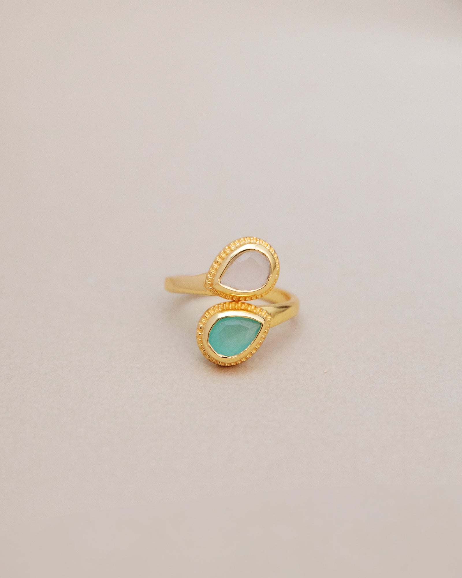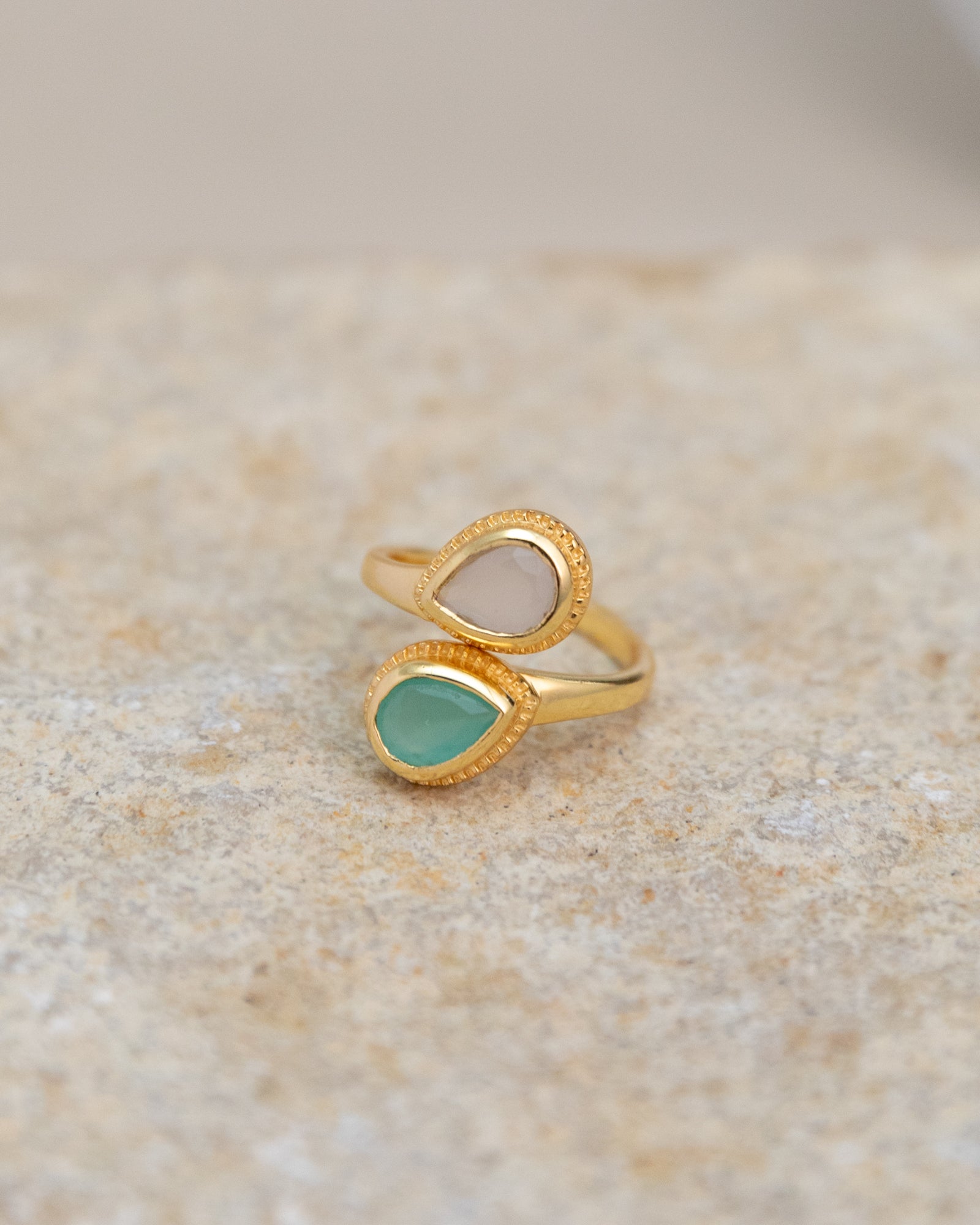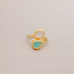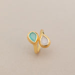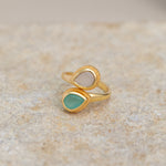 Introducing our Sublime Pear Ring in Aqua Rose Quartz Chalcedony, a captivating and elegant piece that combines the gentle beauty of rose quartz and chalcedony with the refreshing hues of aqua in handmade brass.