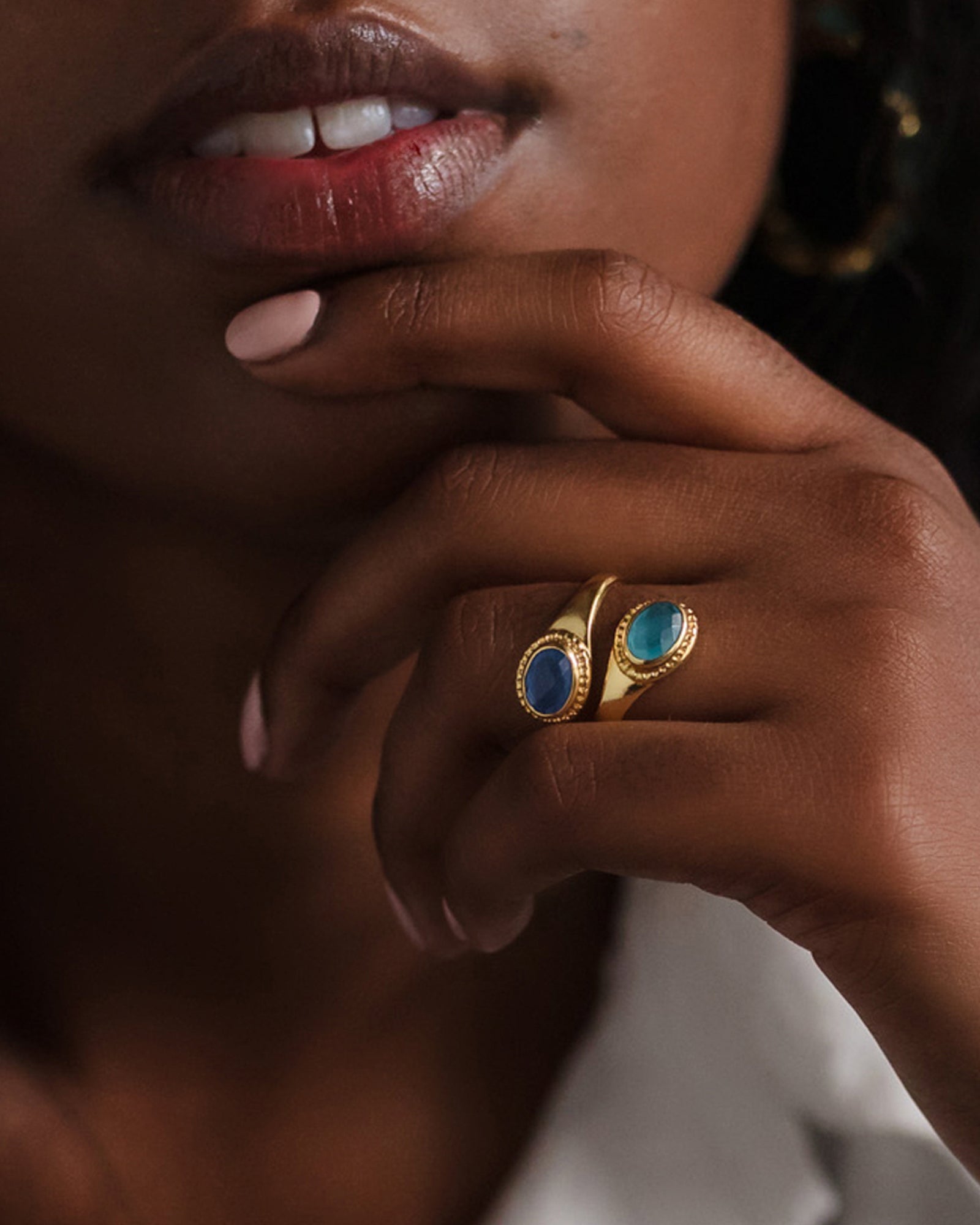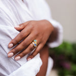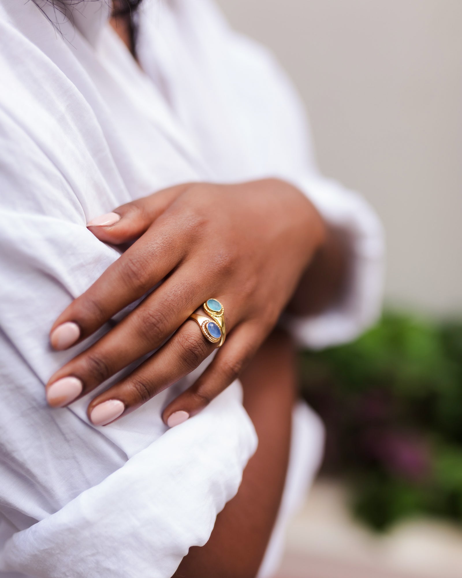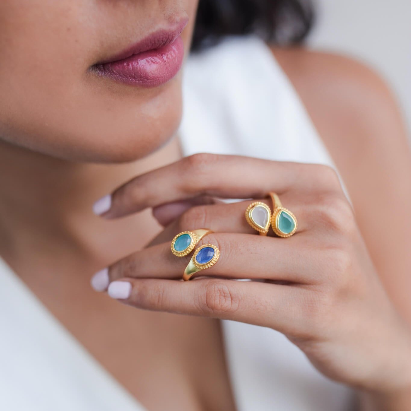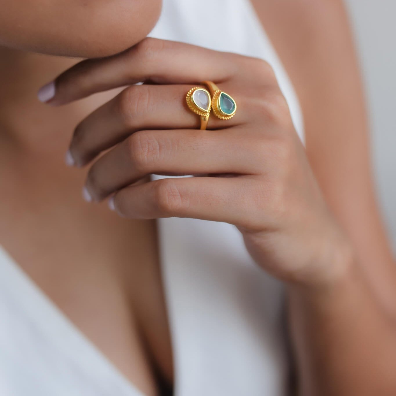 Introducing our Sublime Pear Ring in Aqua Rose Quartz Chalcedony, a captivating and elegant piece that combines the gentle beauty of rose quartz and chalcedony with the refreshing hues of aqua in handmade brass.
